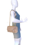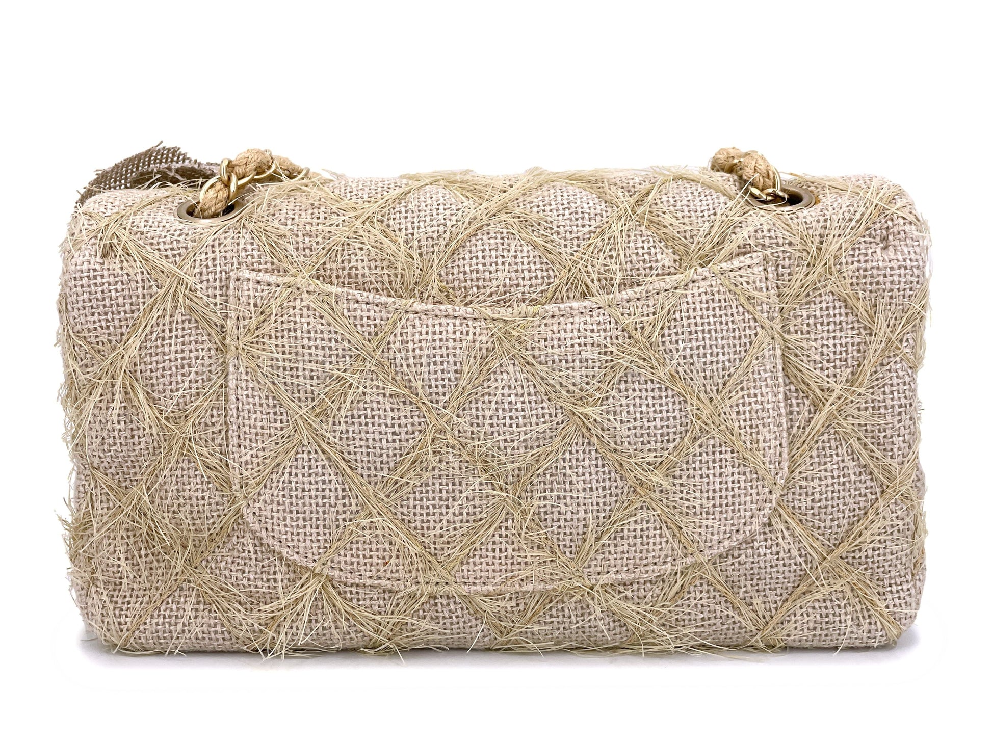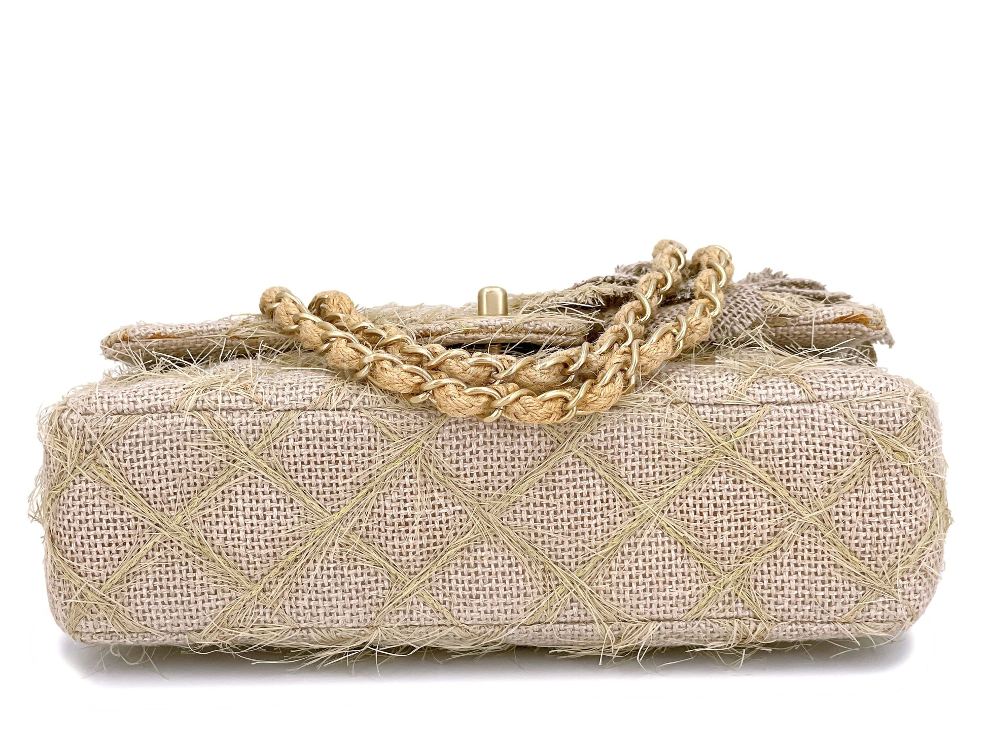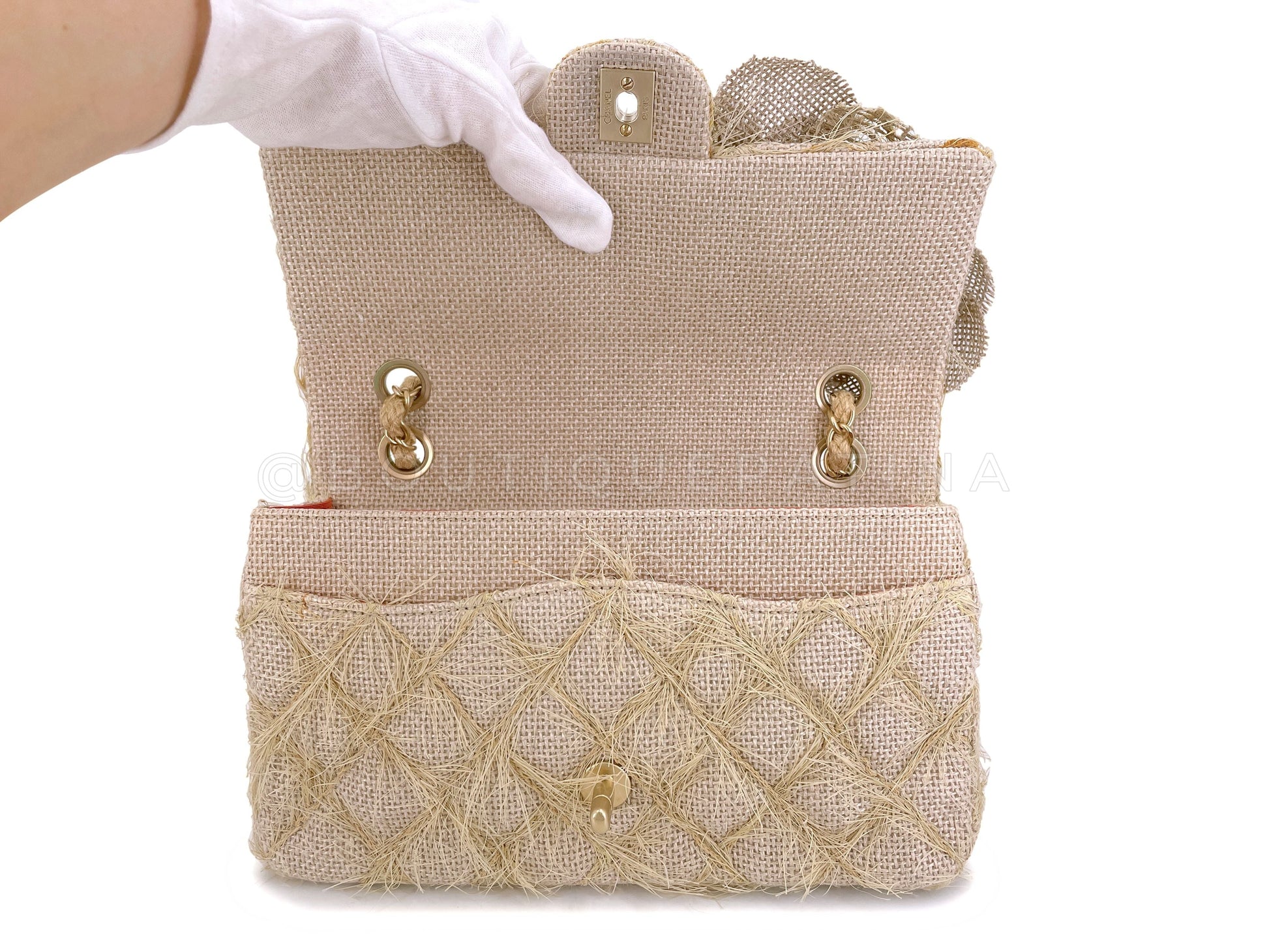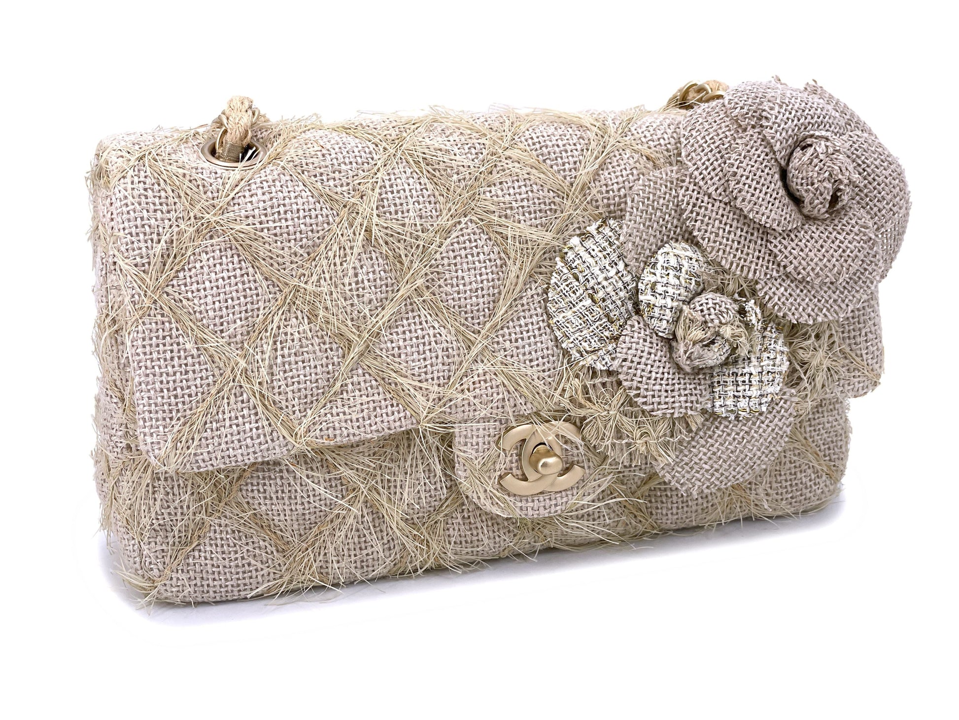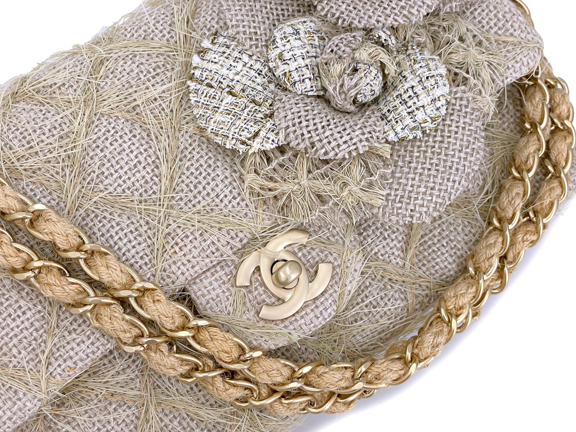 Exquisite attention has been made to the details - the quilts are made with straw/jute, the double woven chain strap is woven with straw fibers and there are two multi-media large camellia flowers on the front of the flap.