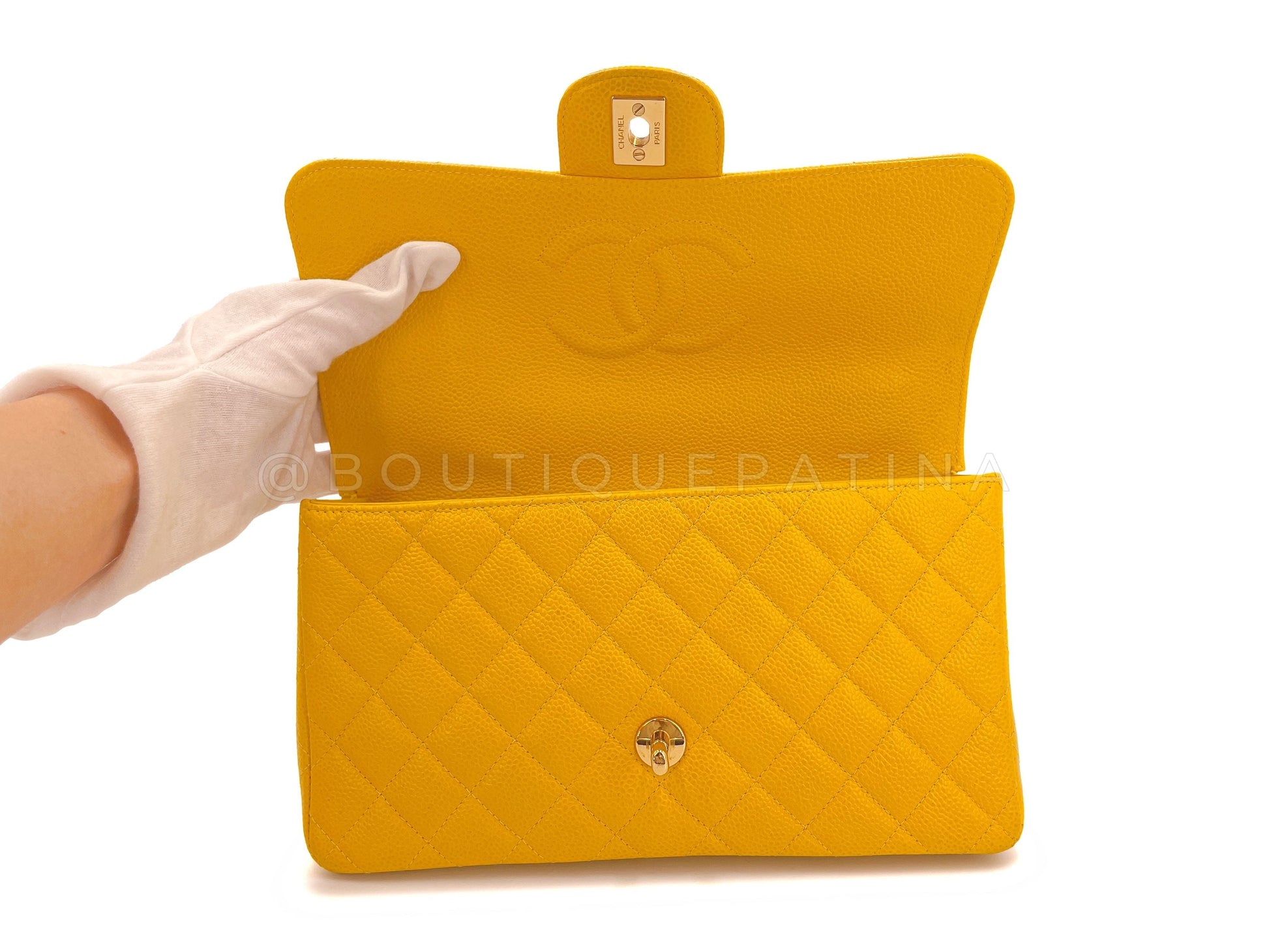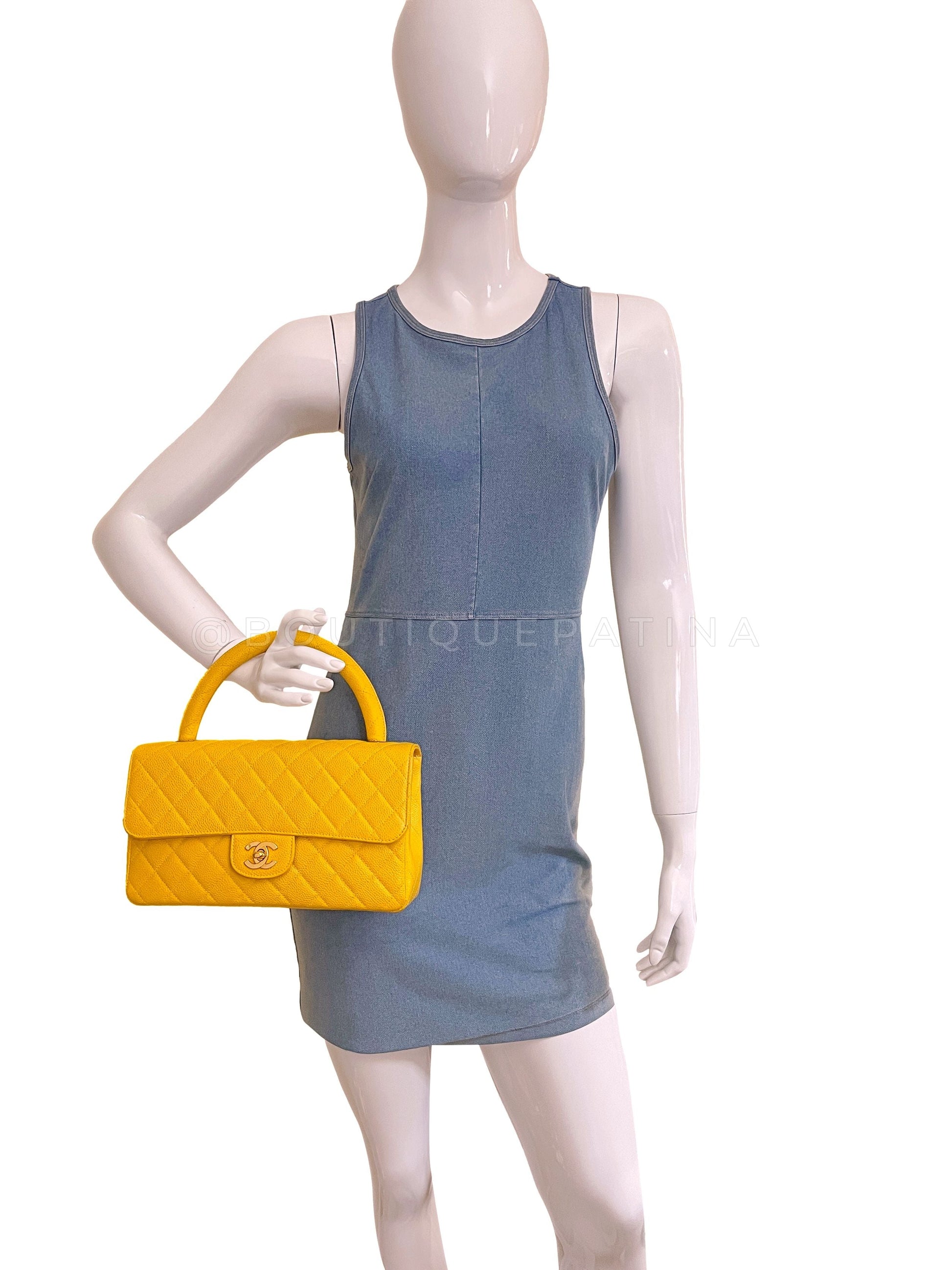 In canary yellow caviar leather and 24k gold plated hardware. The color is a deep, rich canary yellow with mango undertones. Boutique Patina specializes in sourcing and curating the best condition vintage Chanel leather treasures by searching closets around the world.