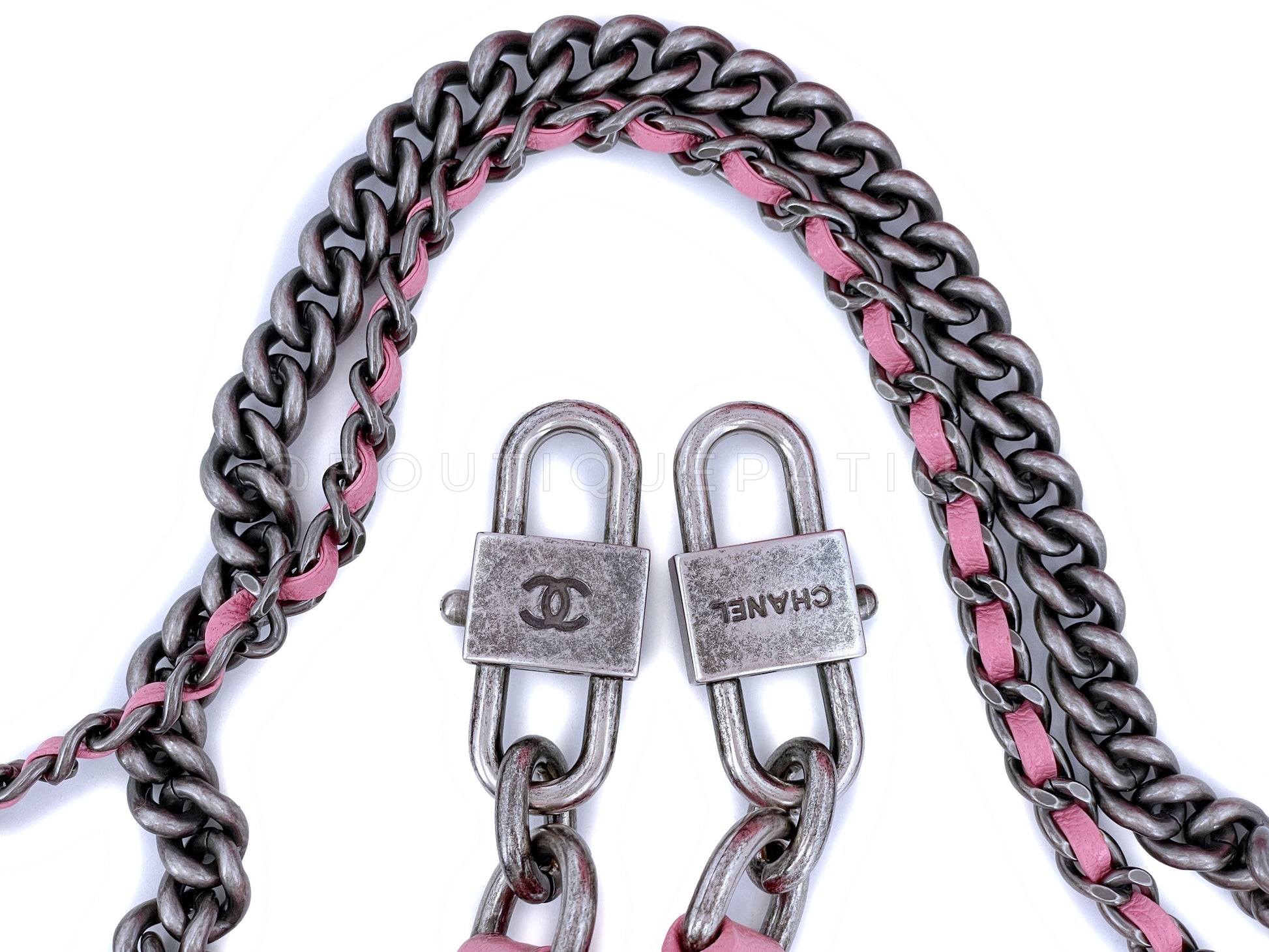 The bag has a detachable adjustable leather shoulder strap and an ornamental double chain, one woven with pink goatskin and the other more a bijoux-style chain.