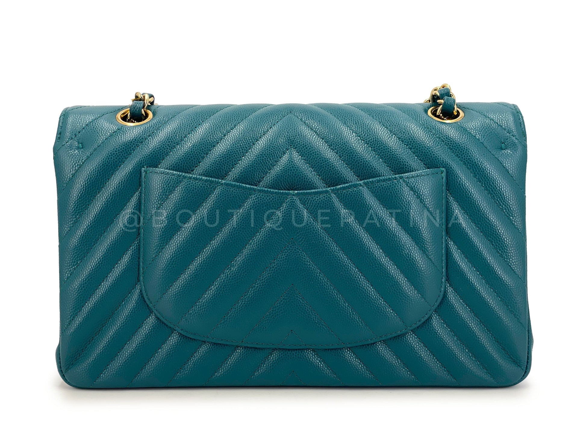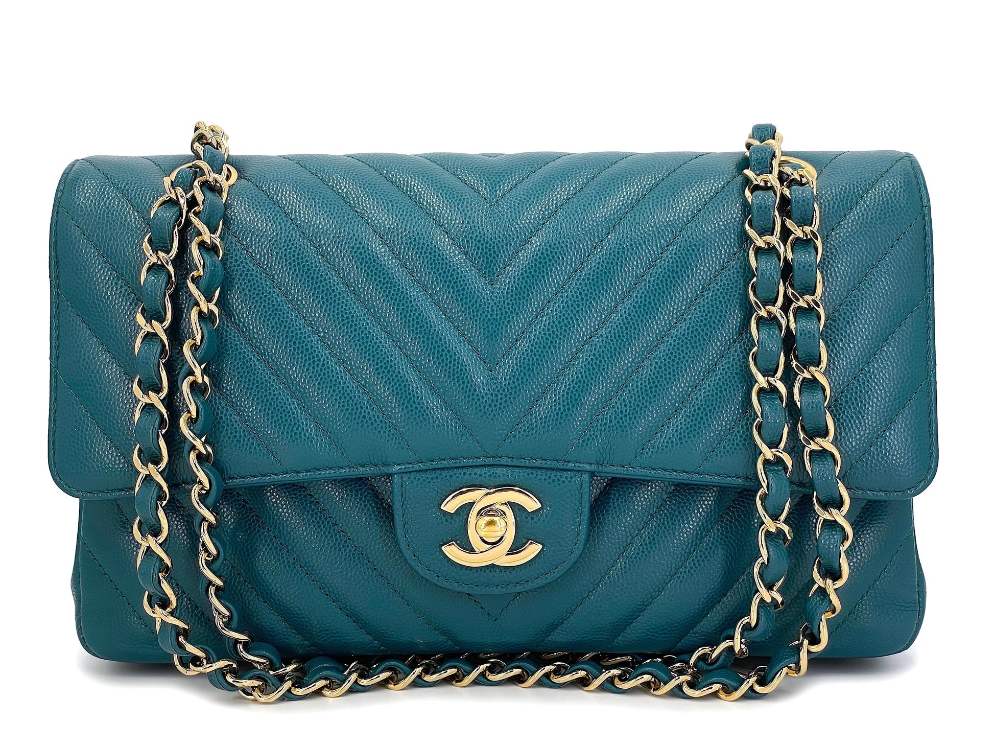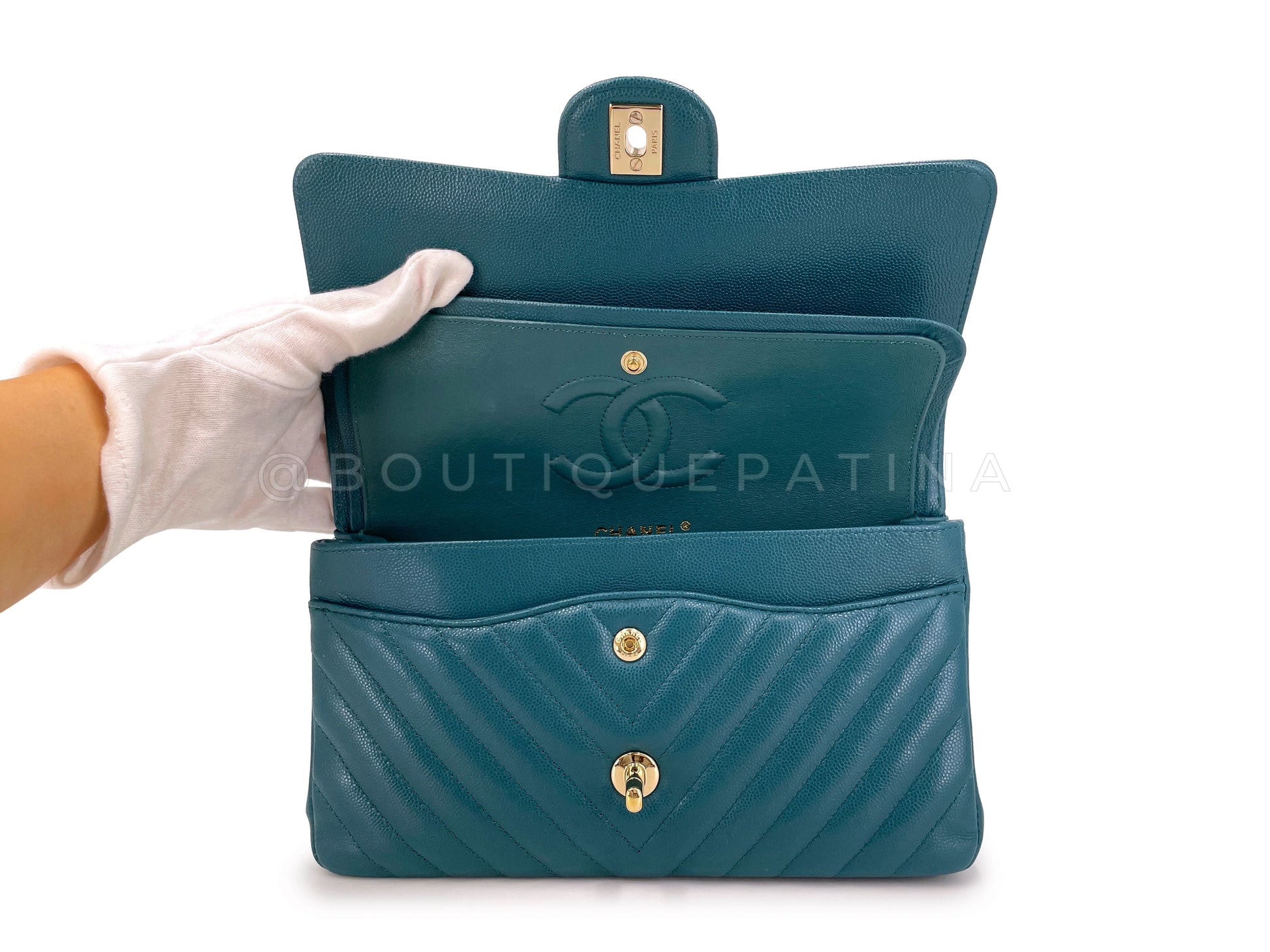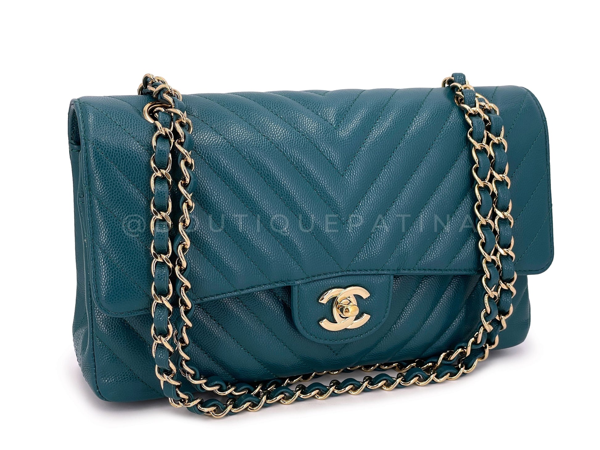 Chanel Teal Green Chevron Caviar Medium Classic Double Flap Bag GHW