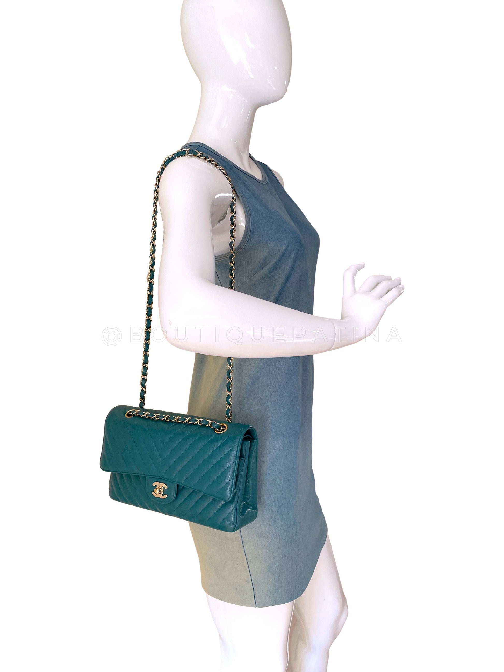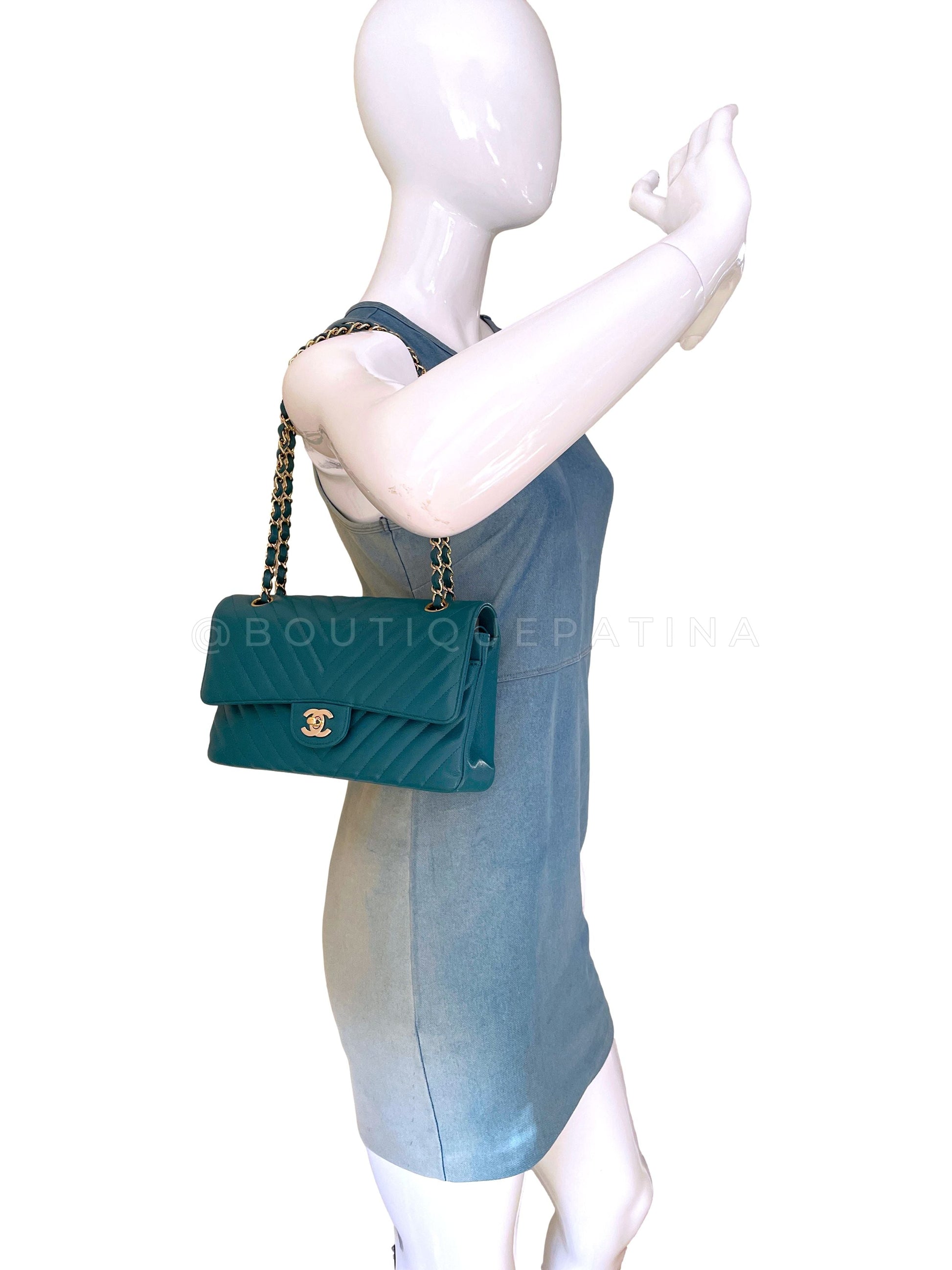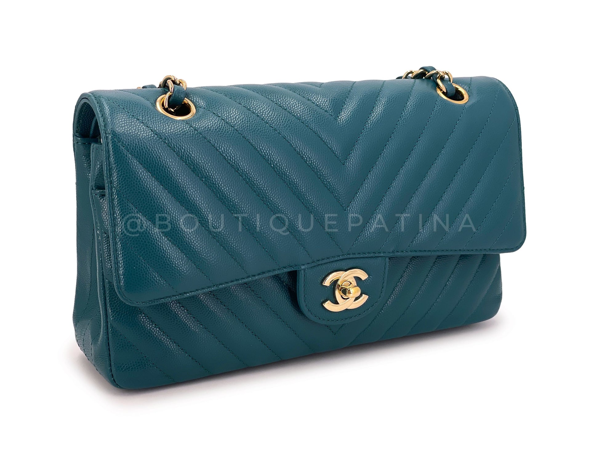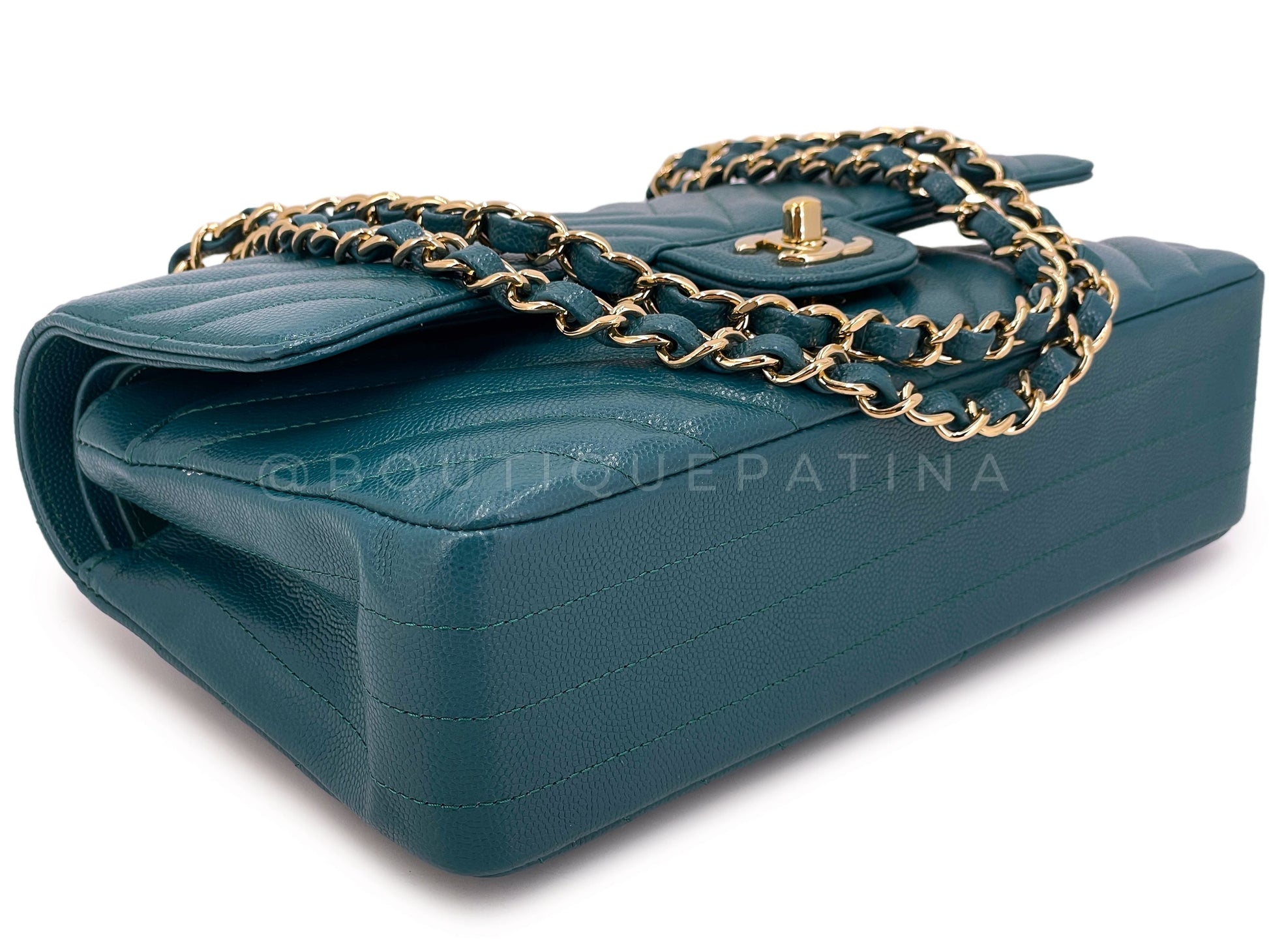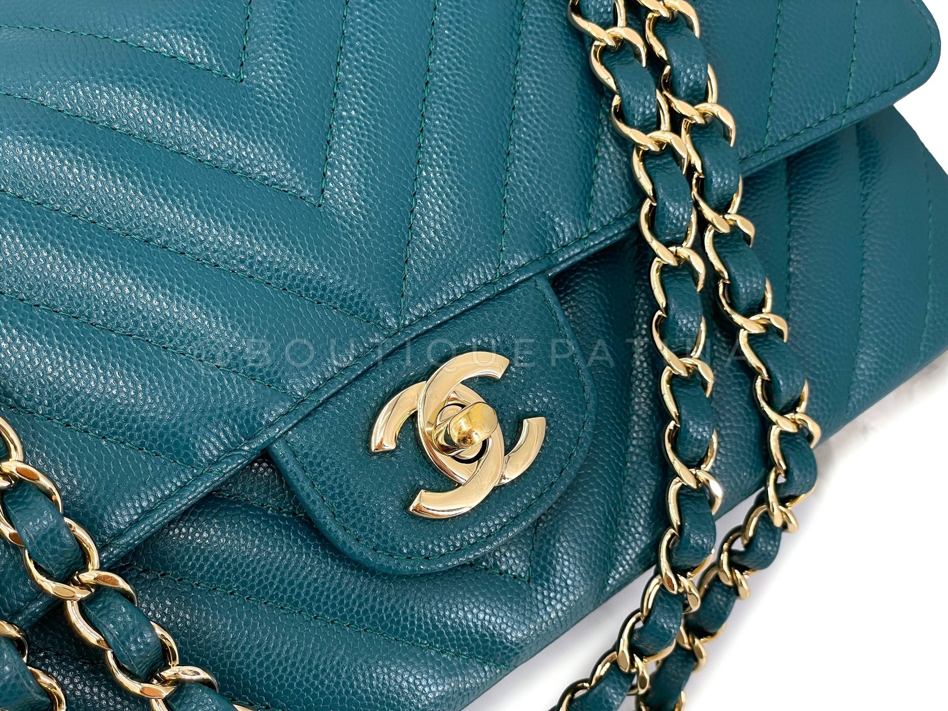 Chanel Teal Green Chevron Caviar Medium Classic Double Flap Bag GHW