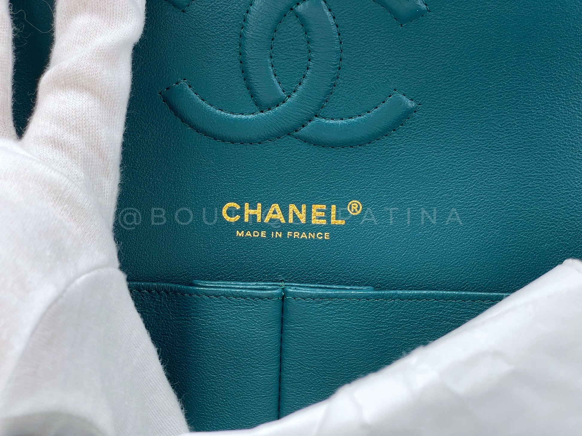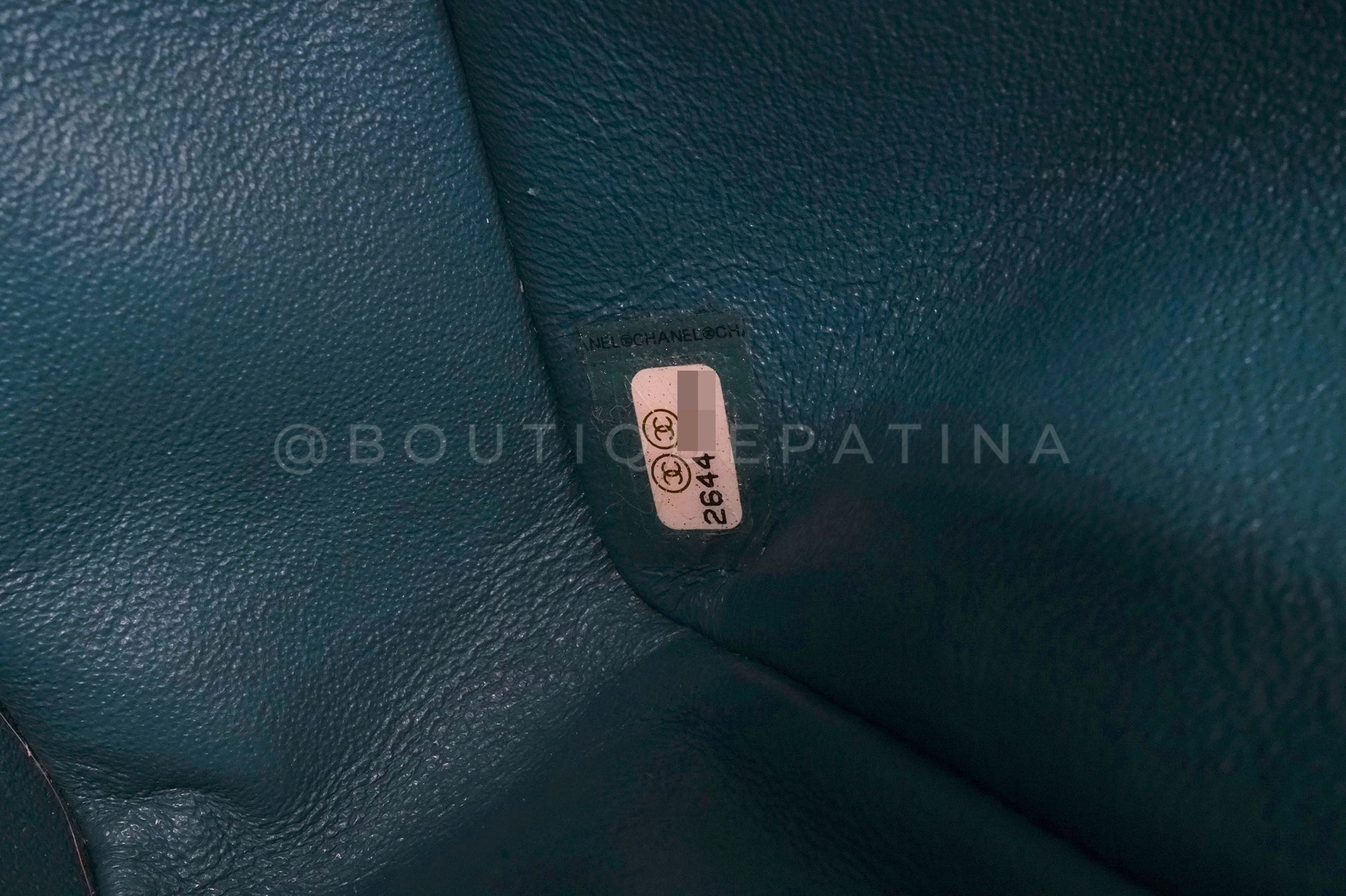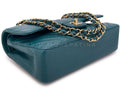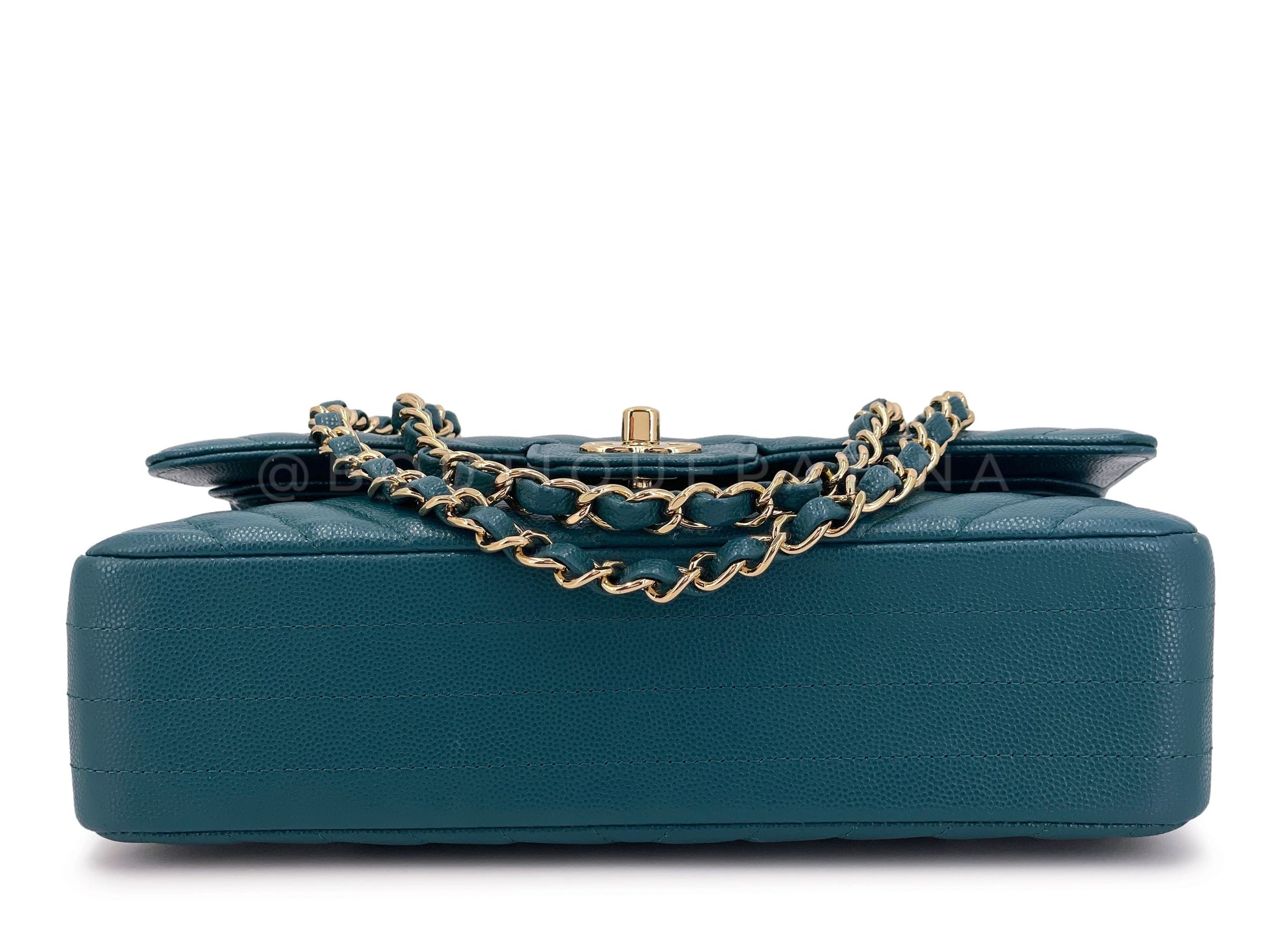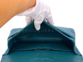 In teal green caviar leather and gold hardware. The color is a deep green-blue, contrasting with shiny gold hardware. In caviar leather, the classic flap is durable with the pebbled grain nodes of calfskin leather.