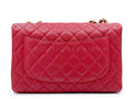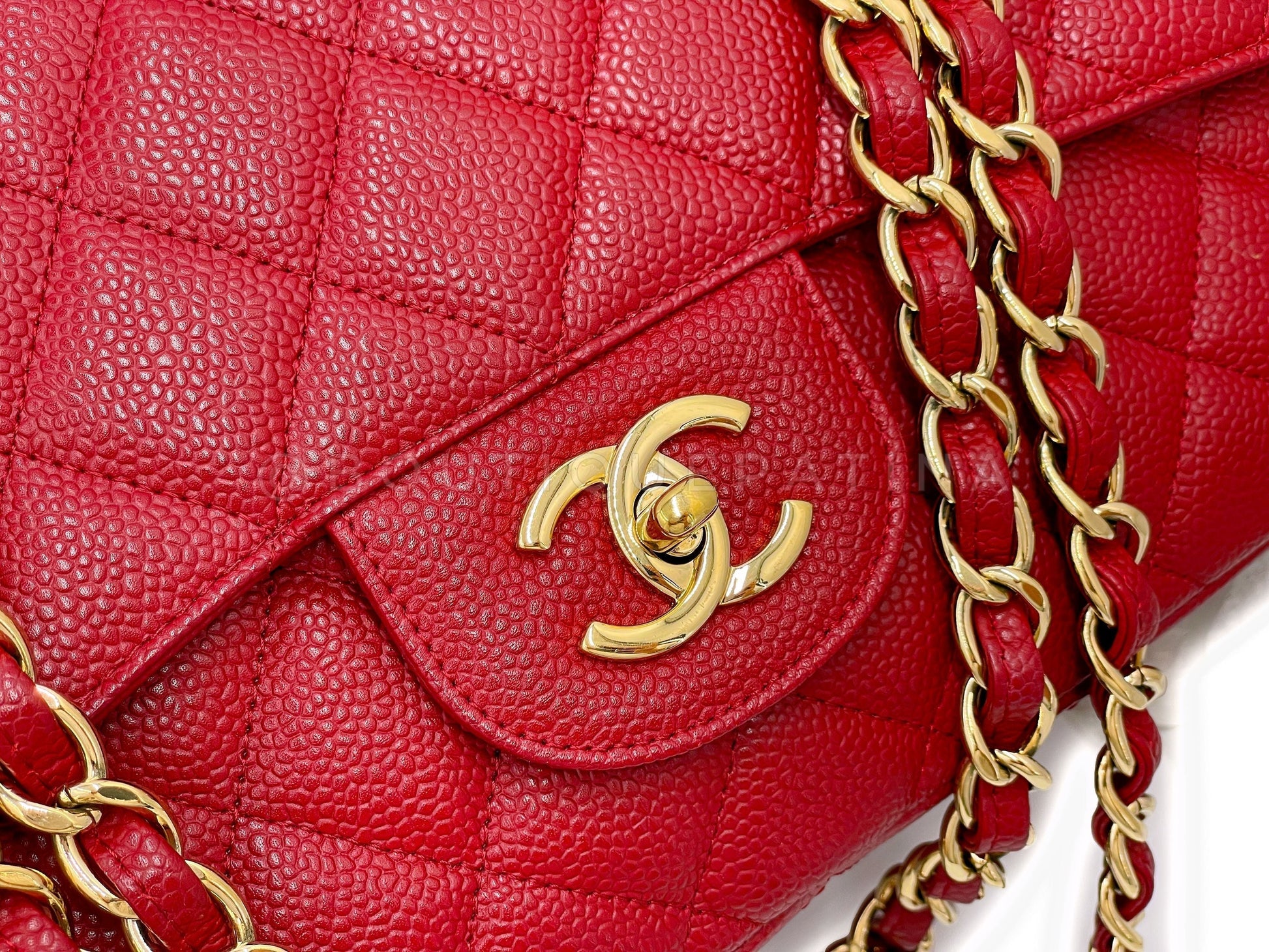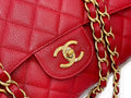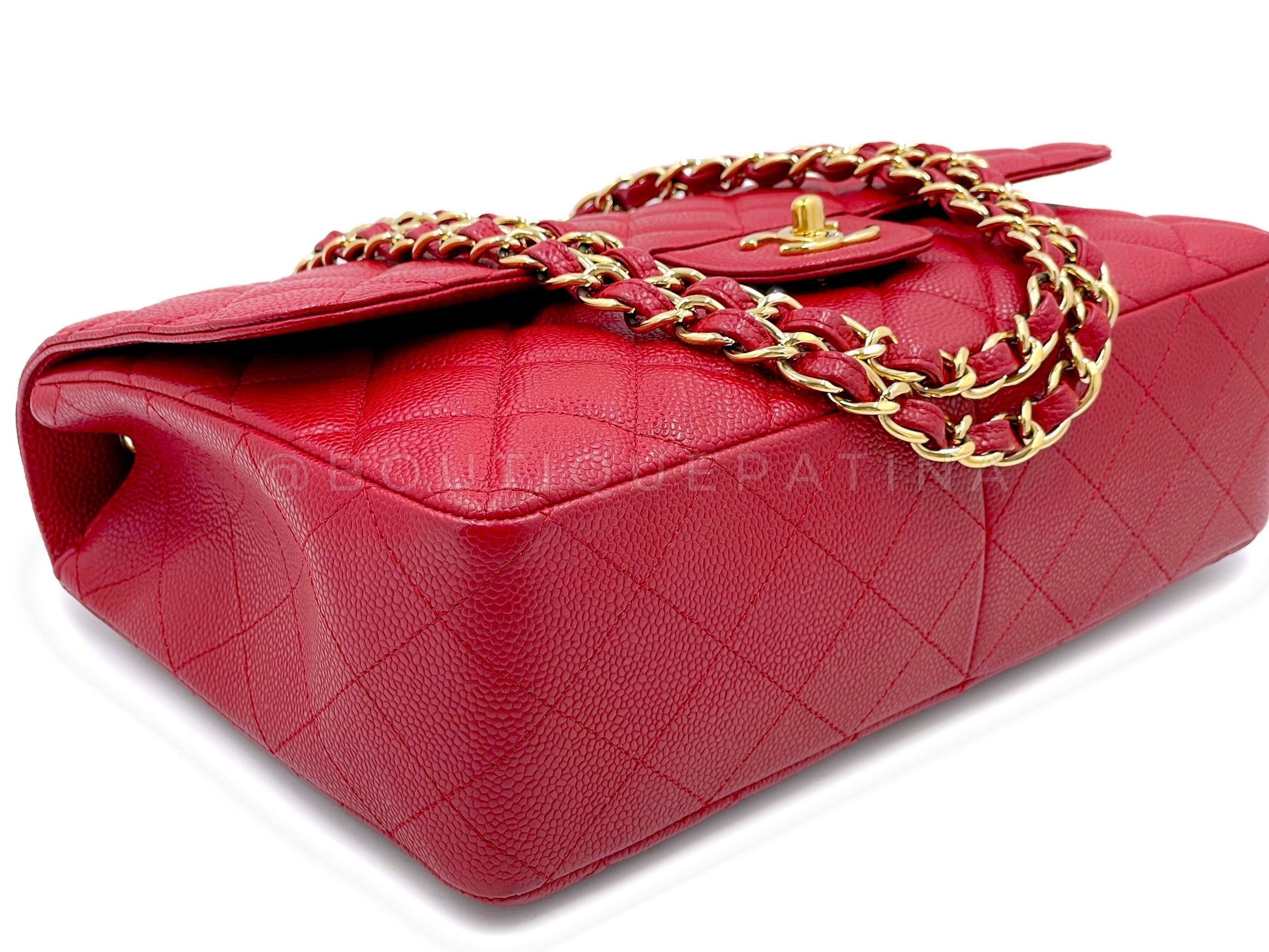 In caviar leather and shiny gold hardware. In caviar leather, the classic flap is durable with the pebbled grain nodes of calfskin leather.