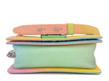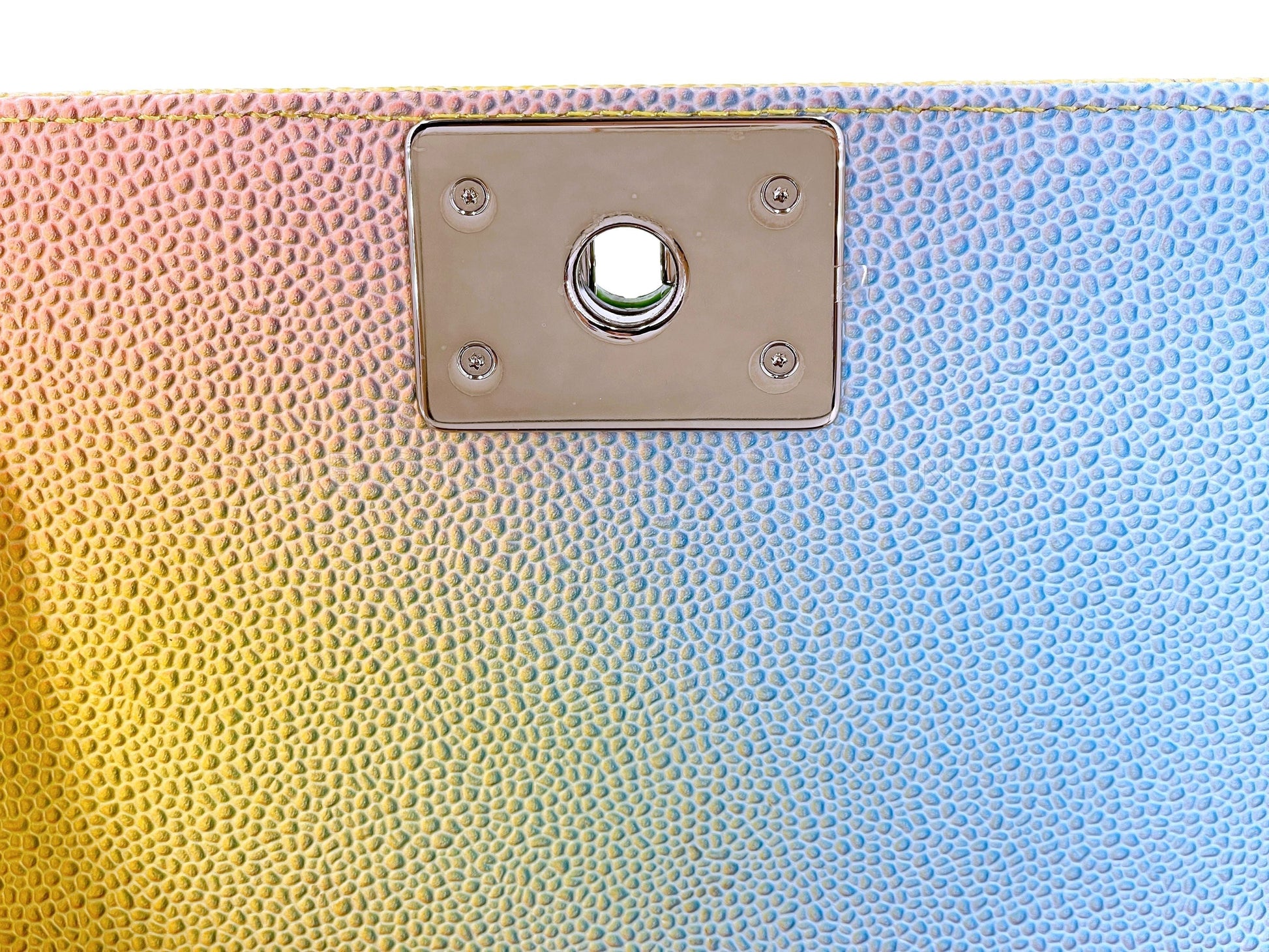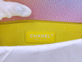 The "rainbow caviar" version was first introduced in 2017 Cruise in Karl Lagerfeld's Coco Cuba runway show, and then a pastel version later introduced in 2018. The bright lime green front resin clasp with silver CC overlay is a hallmark of this specific model.