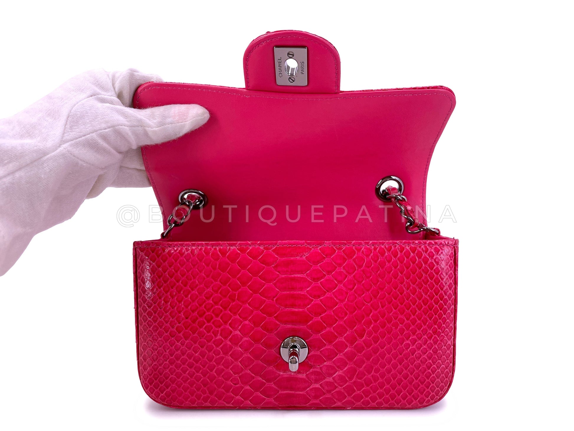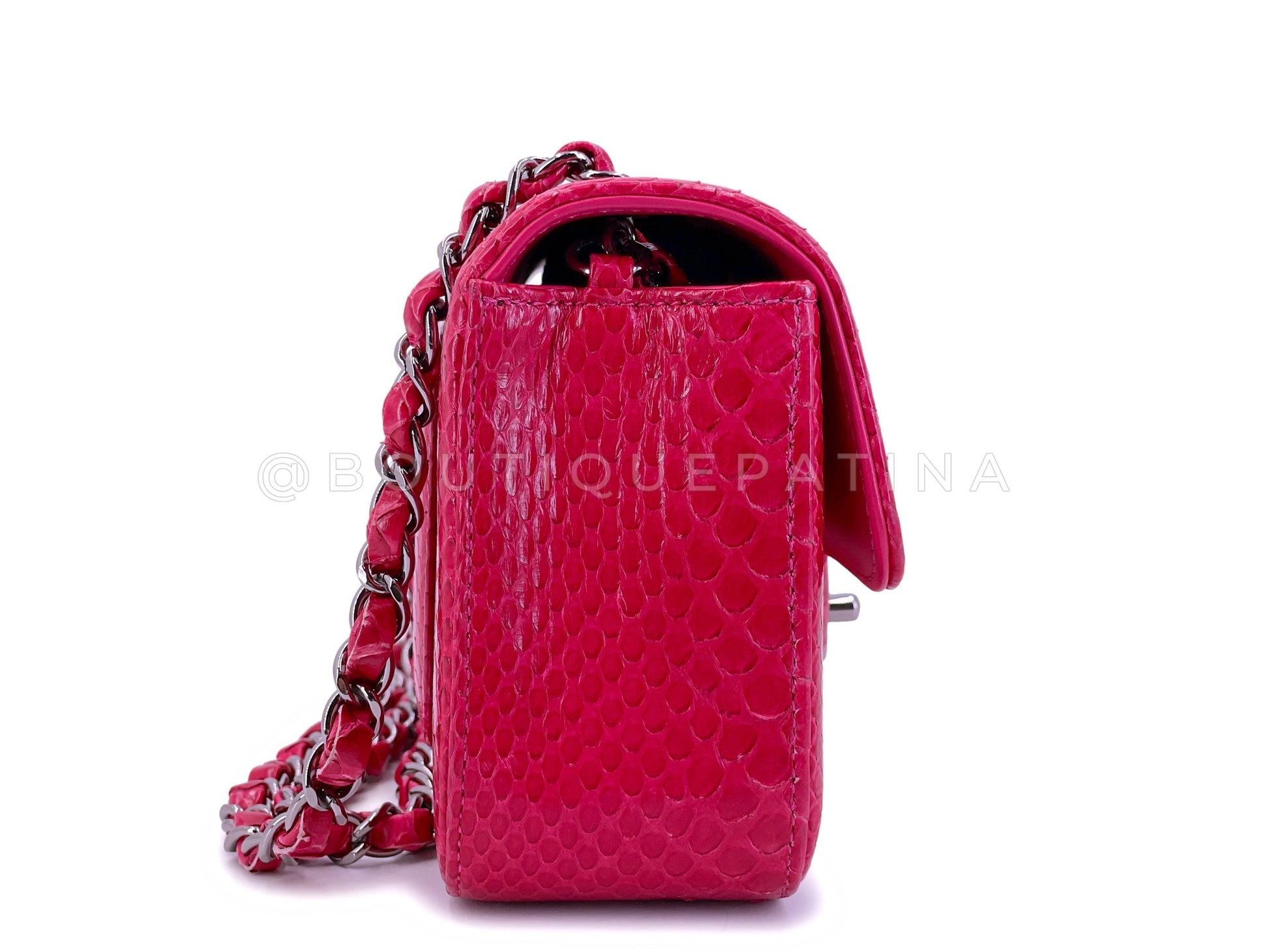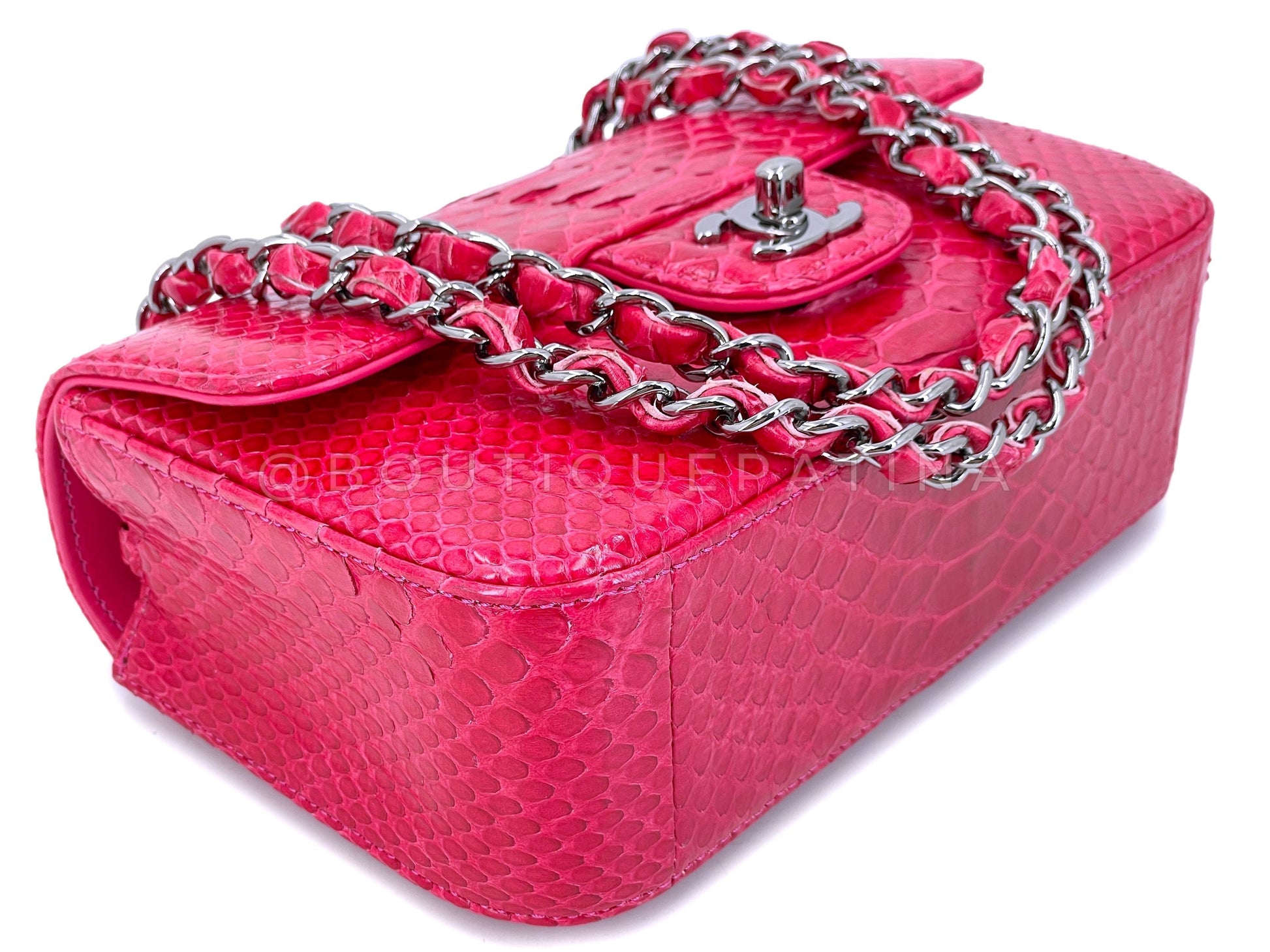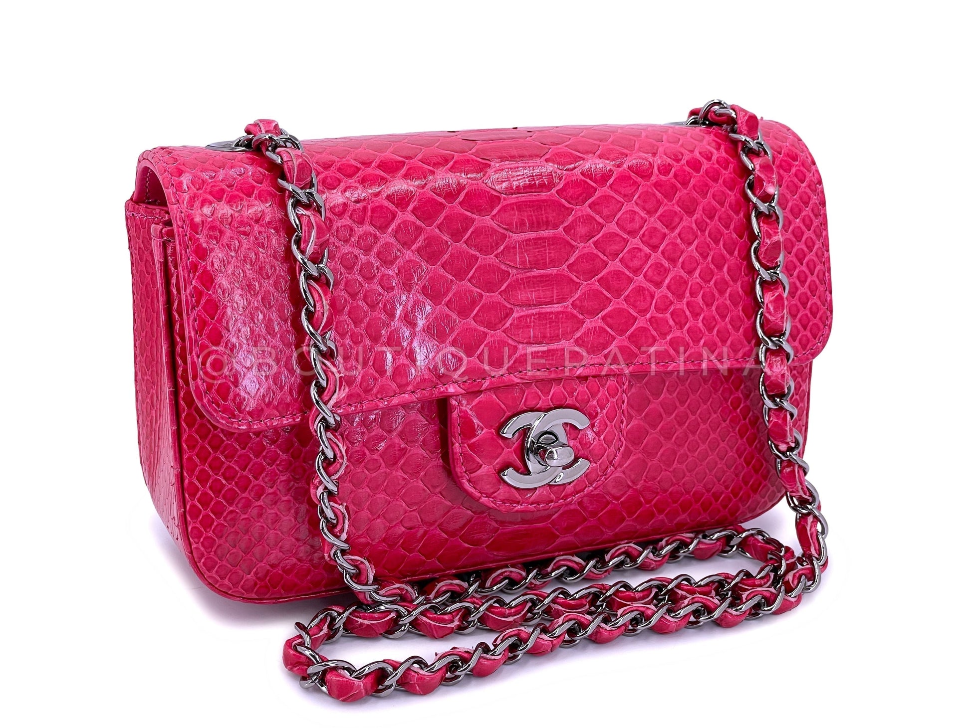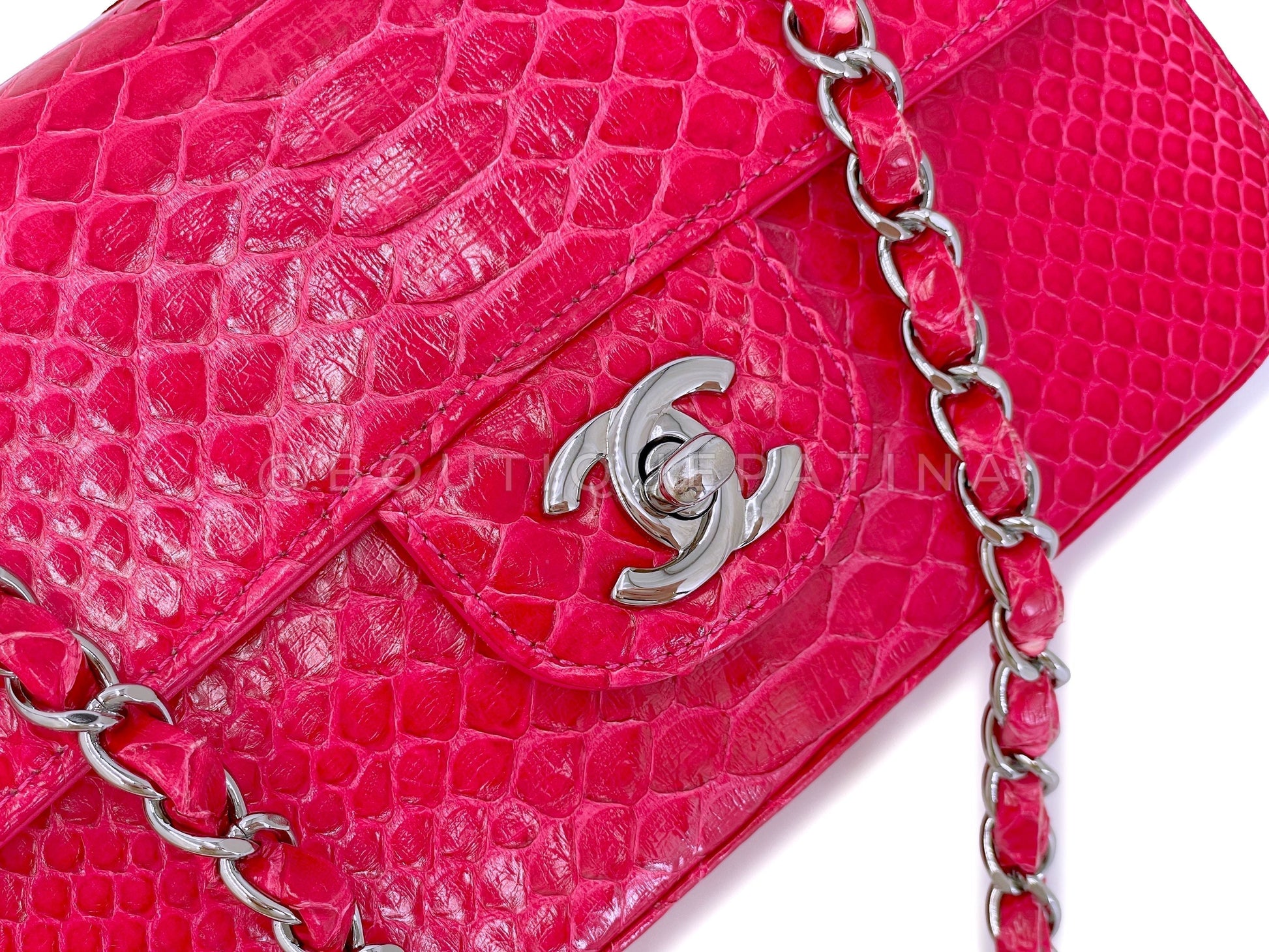 In fuchsia pink python and shiny ruthenium hardware. Established 19 years ago, Boutique Patina has specialized in sourcing and curating the best condition vintage Chanel leather treasures by searching closets around the world.