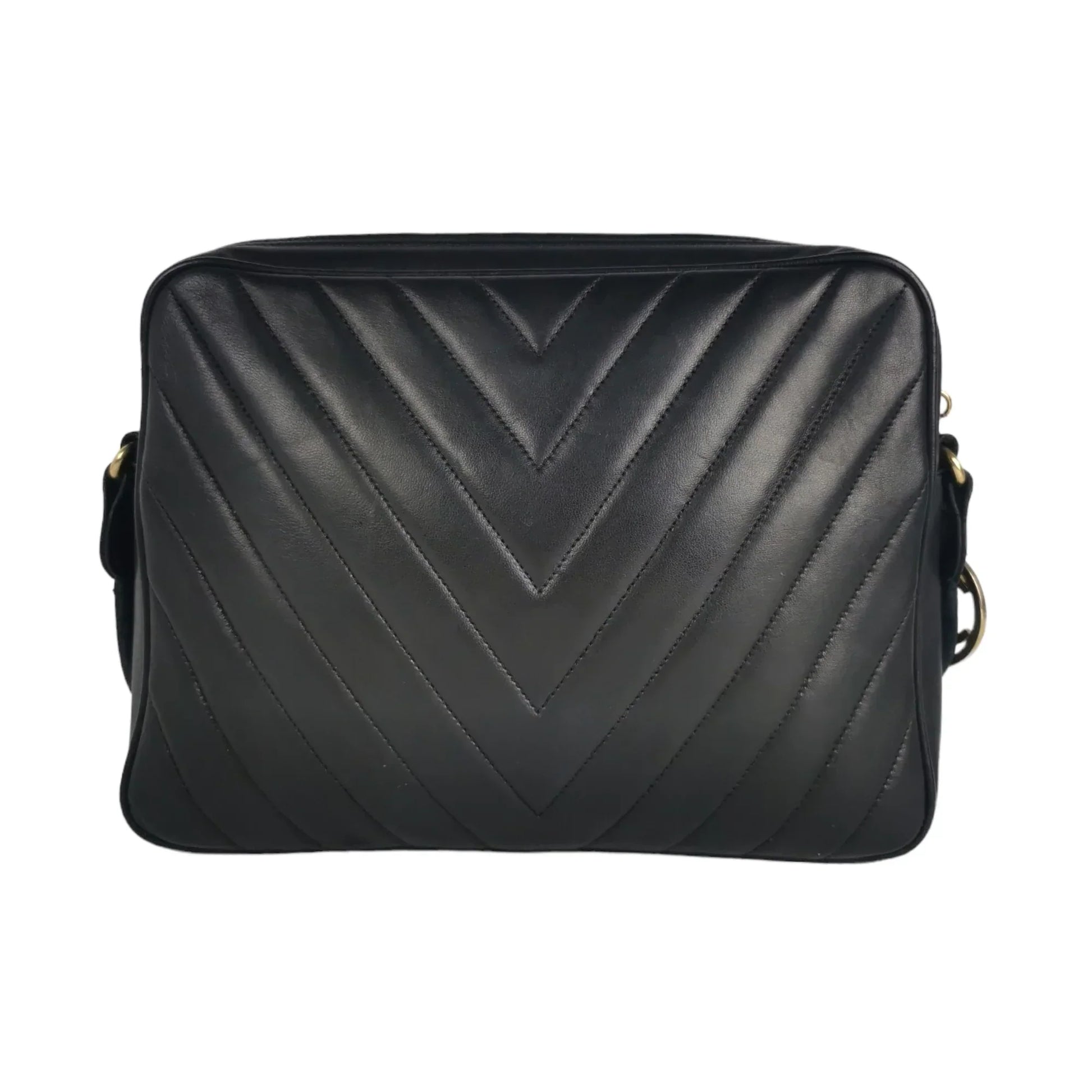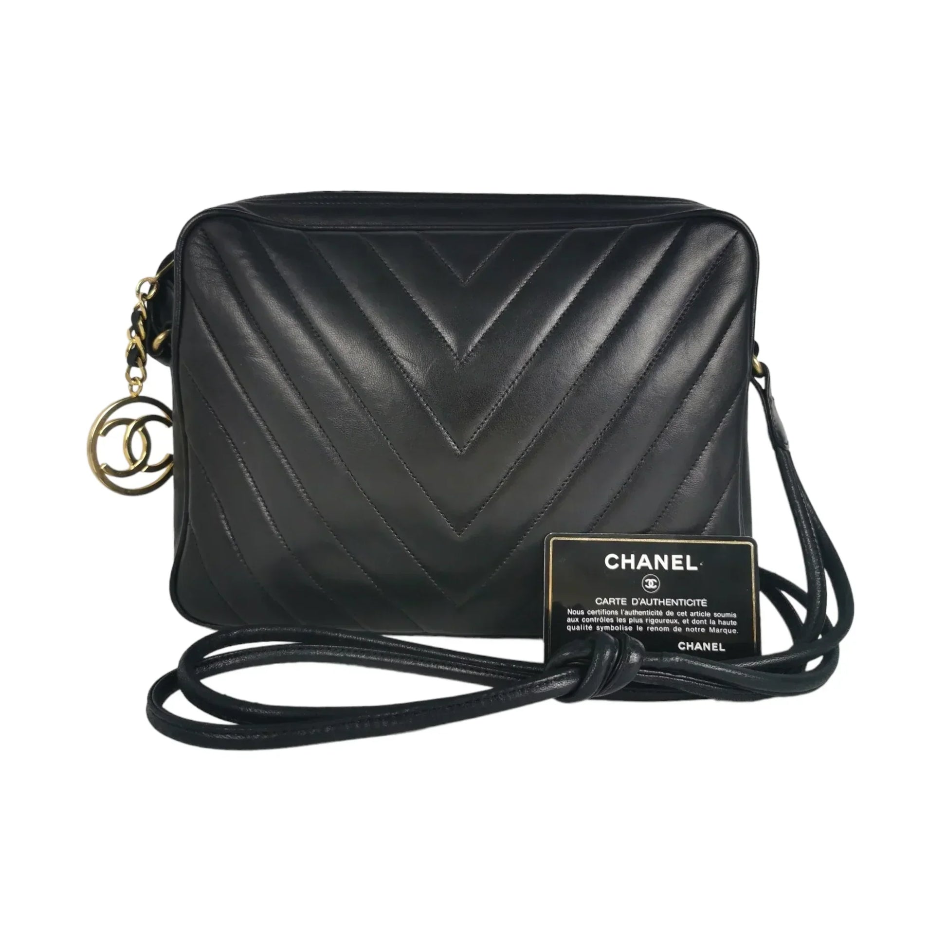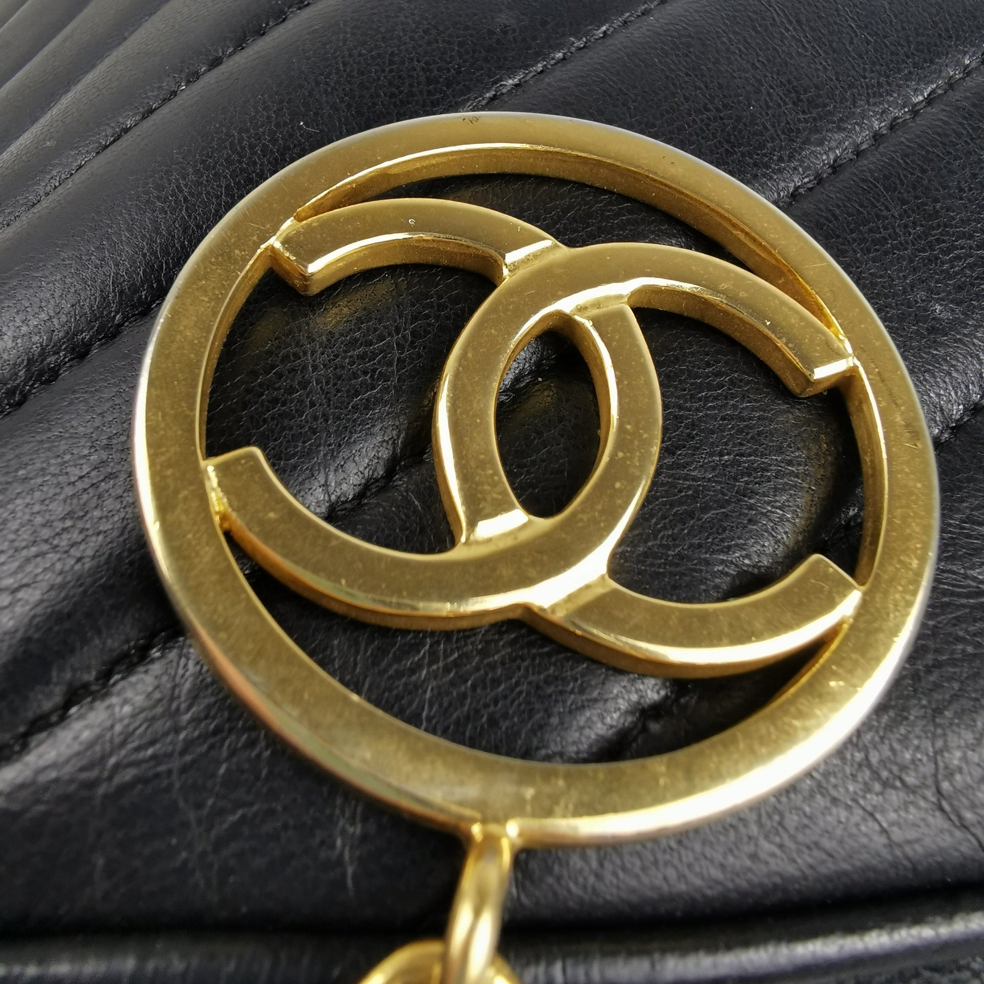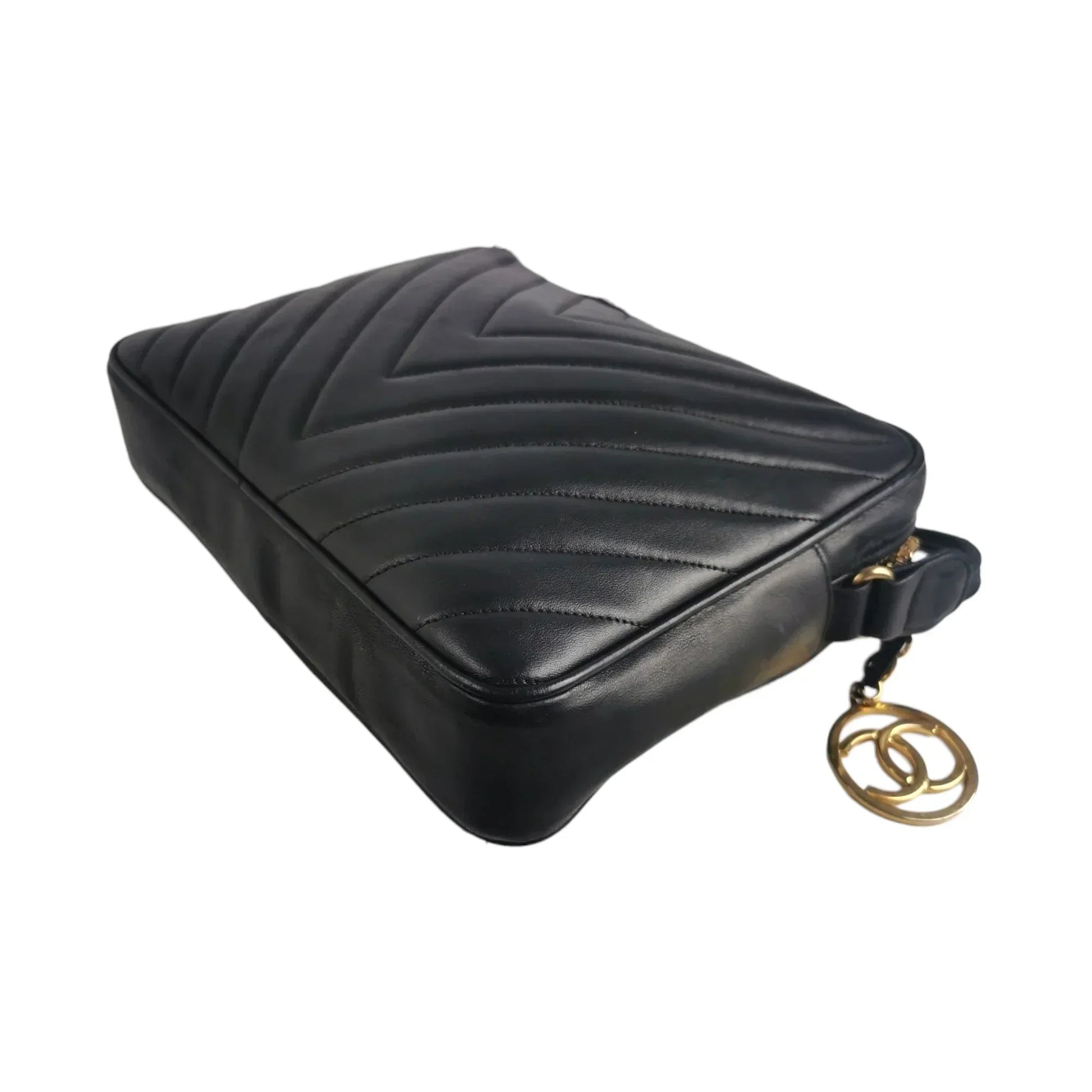 A rare Chanel shoulder bag in a black lamb leather, which has the V-shaped Chevron quilting and golden hardware. The interior is lined with black leather and has two zip compartments.