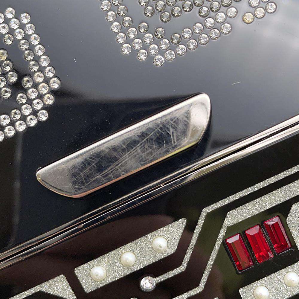 | Condition Details | Surfaces / Scuffs, Dark marks Interior/Scuffs?Pressed marks Shoulder/Scuffs Metal/Scuffs?Dents?Dark marks Odor/Yes (Slight Odor due to Deterioration) *Rhinestone chipping can be seen. |