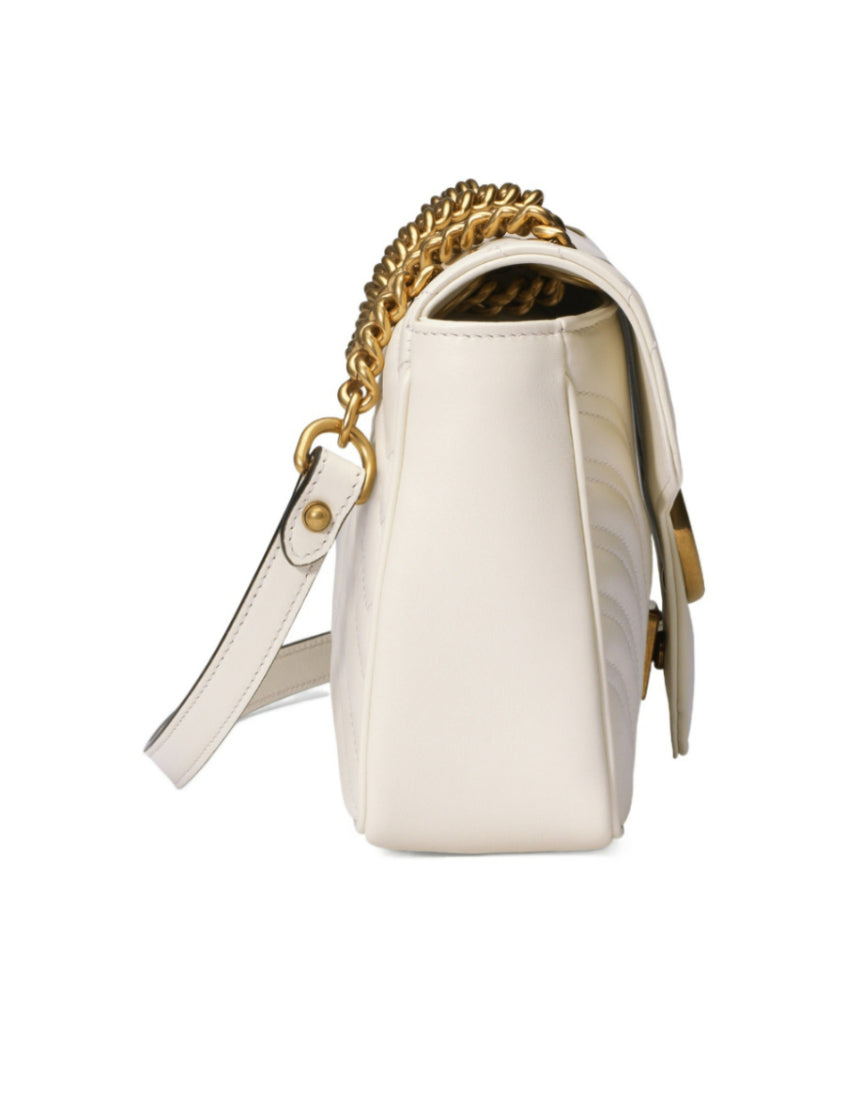White GG Marmont small quilted shoulder bag, white quilted V-shaped patterned leather with heart print. Bronze metal hardware, double G, zipper inside pocket. (This item is packaged in a dust bag or box)