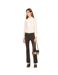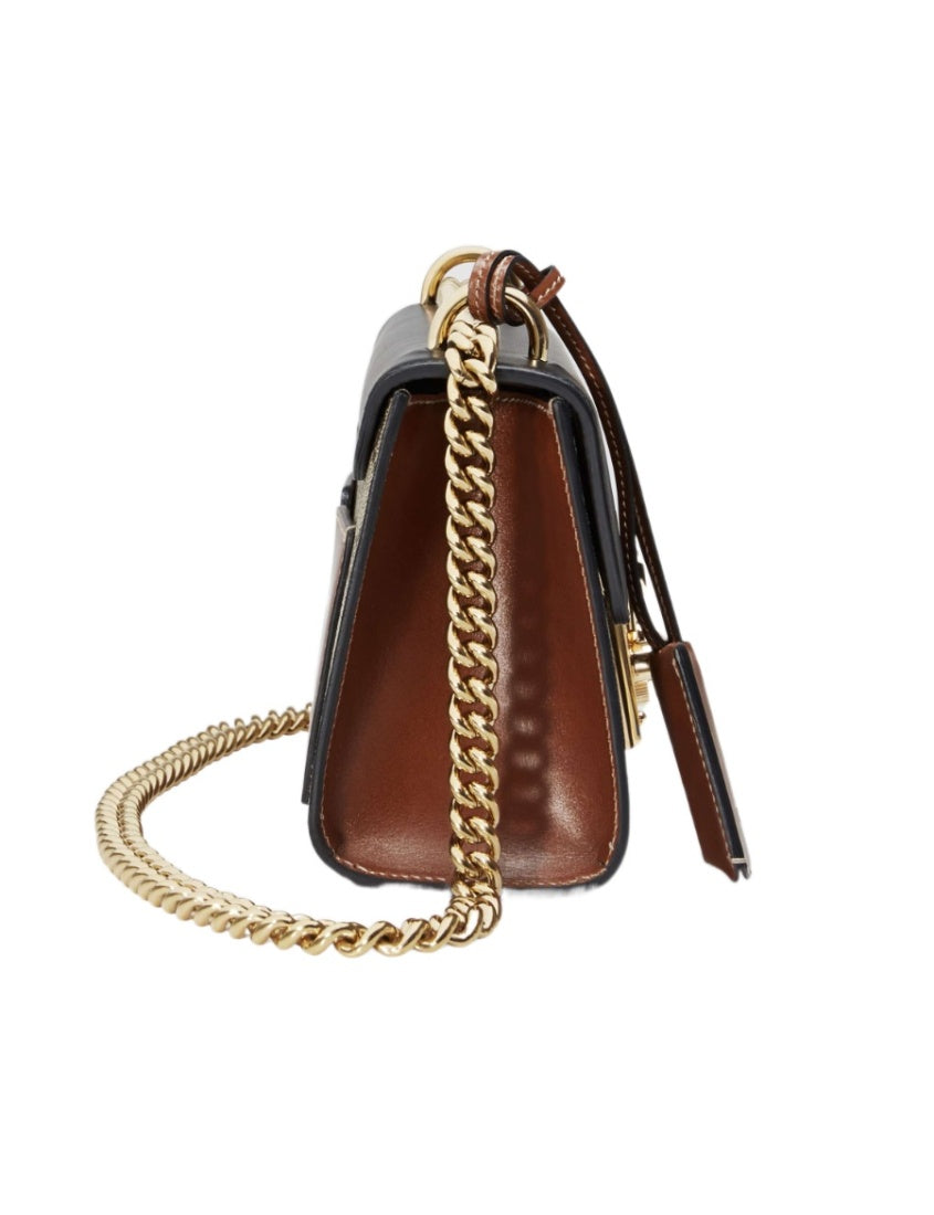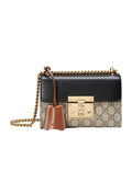 Beige and black Padlock small shoulder bag with leather top and side inserts, sliding and adjustable chain strap, one exterior open pocket and key lock clasp. (This item is packaged in a dust bag or box)