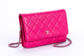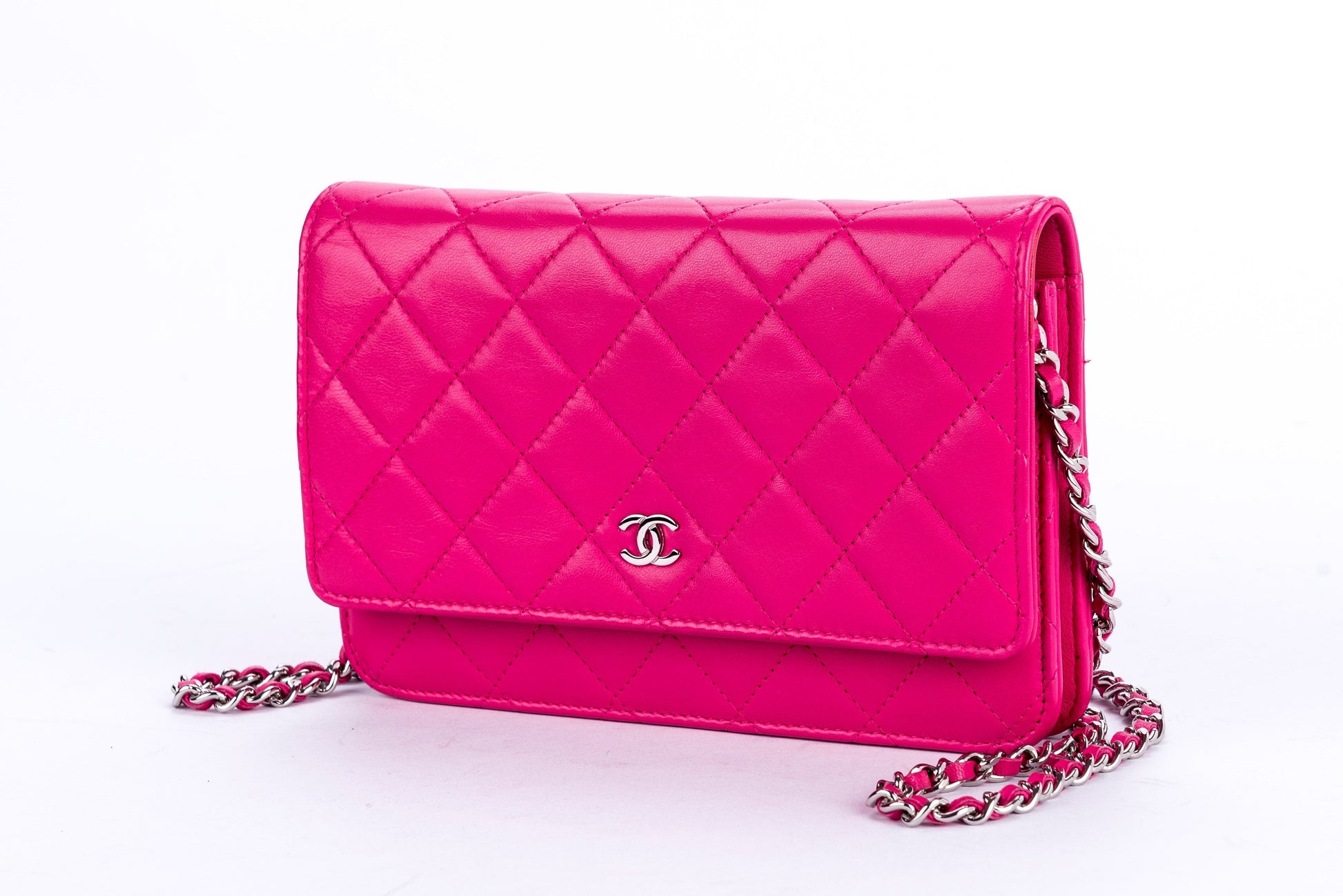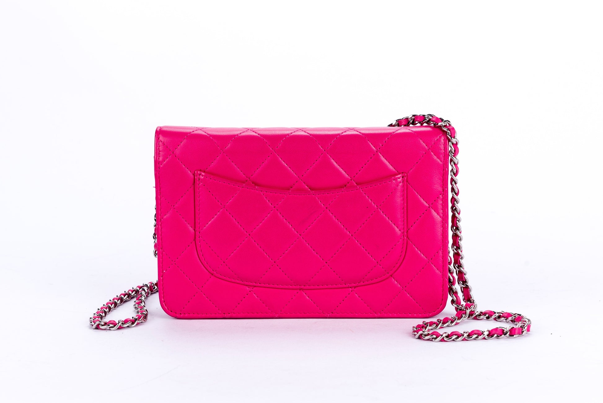 One of the most versatile Chanel product, it can be used in 5 different way - wallet, evening clutch, crossbody bag for travel, shoulder bag with short or long strap. This Chanel Wallet on Chain features a beautiful hot pink color, classic Chanel quilted design, interlaced leather metal chain and silver hardware. It is in good condition, interior and exterior has little to no flaws. Comes with original ity , dustcover and box.