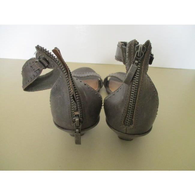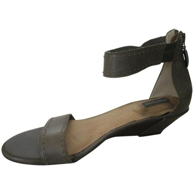 Adam Tucker taupe gray elasticized ankle strap open toe sandal flats. 3-1/2" back zipper closure. Studded accents throughout. 2" wedge heel. Signature padded insoles. All measurements are approximate.