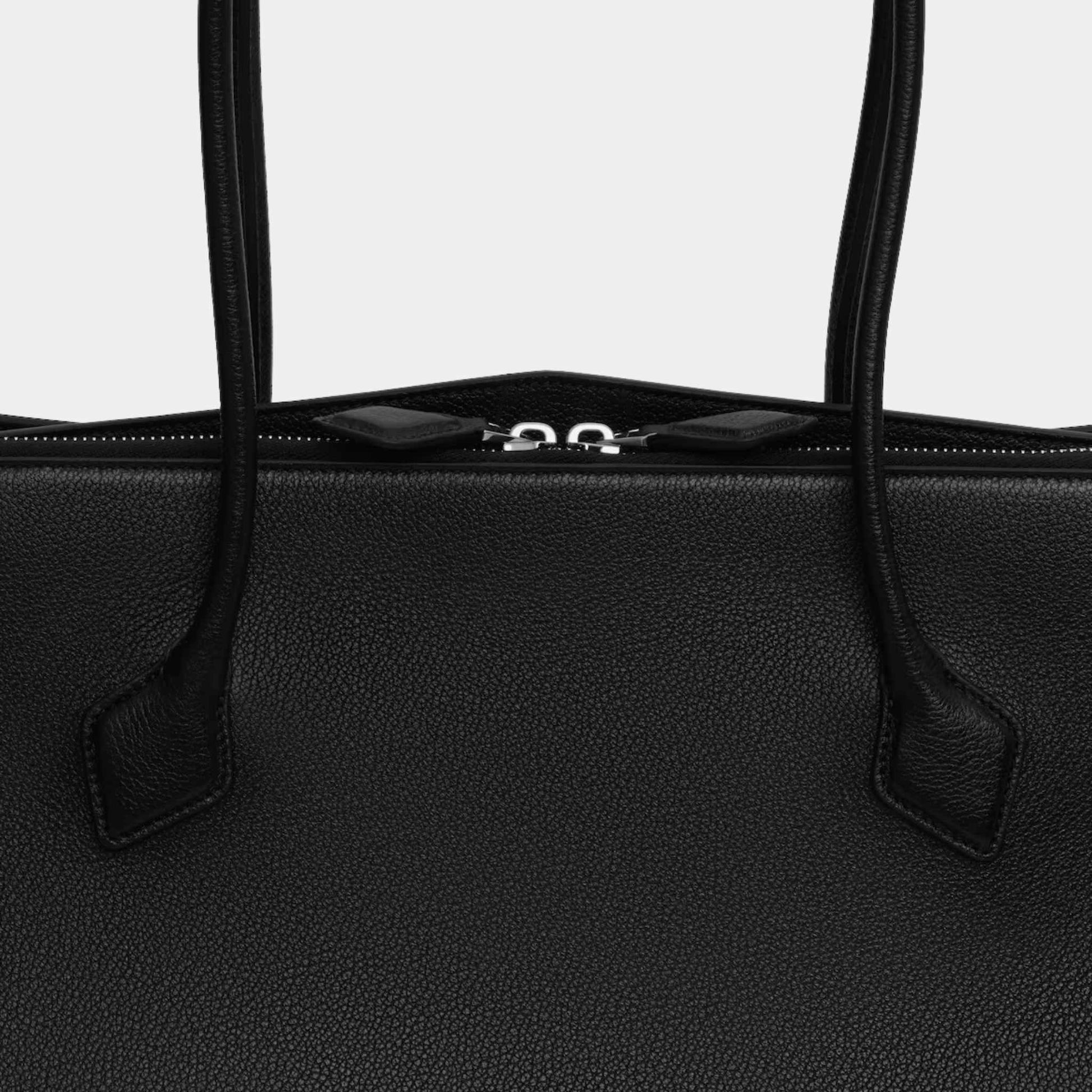 The Alaïa Le Teckel Tote Bag is a luxurious and spacious companion for everyday life. Crafted from exquisite shiny grained calfskin leather, this elegant tote exudes sophistication and timeless style. Its distinctive design incorporates signature geometrical details, reflecting the brand's avant-garde aesthetic. The spacious interior, featuring two large gussets with magnetic closures and a convenient front pocket with a double zip closure, provides ample room for all your essentials. The long tubular handles with decorative ties offer comfortable shoulder carry, making it perfect for everyday use.
