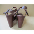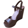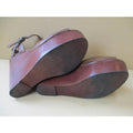 Classic - casual - brown platform sandals had 5 inch wood grain wedge heel with 1 inch rise. 1/2 inch wide single ankle strap closure. Brass hardware. Signature insoles. All measurements are approximate.