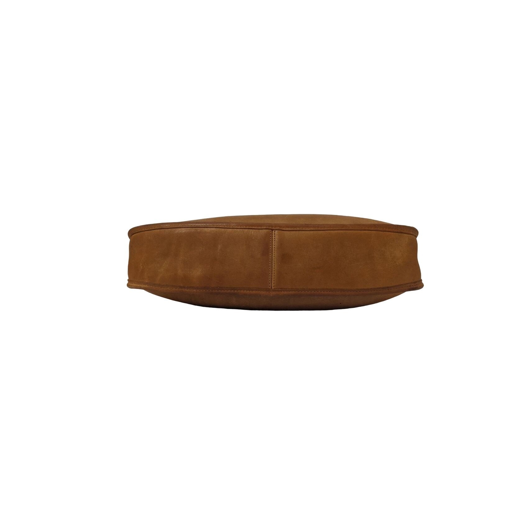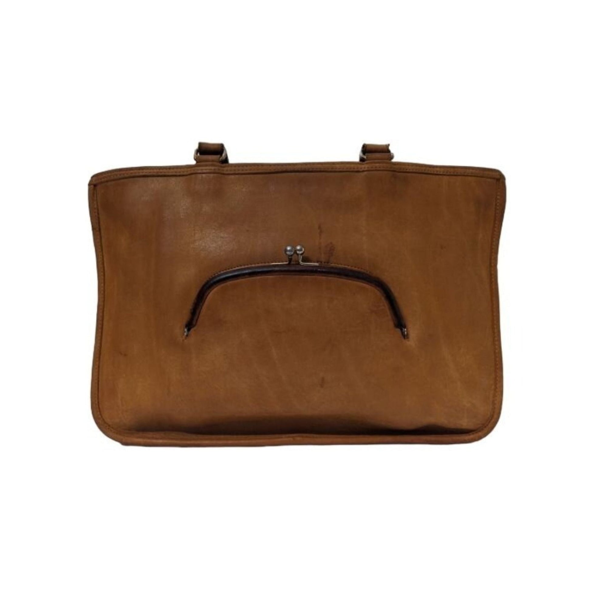 The bag is a large, classic, top handle, handheld satchel style bag that you could add a shoulder or cross body strap for a two-way style . The purse is made from buttery soft saddle colored, refined calf leather, and brass hardware. It has a zip, top closure and an exterior kiss closure pocket on the front. There are two hard leather handles, but you could add a cross body/shoulder strap, if you like!- see pictures.