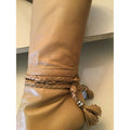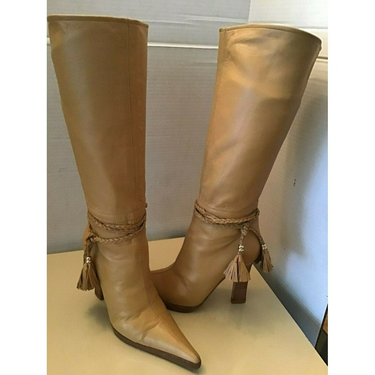 These shoes are the perfect pair of boots when you're looking for something with a little something extra!leather with leather accents braided and gold beaded with tassels that wrap around your ankles Boots have pointier toes and thinner 4" heels in a semi-platform style.