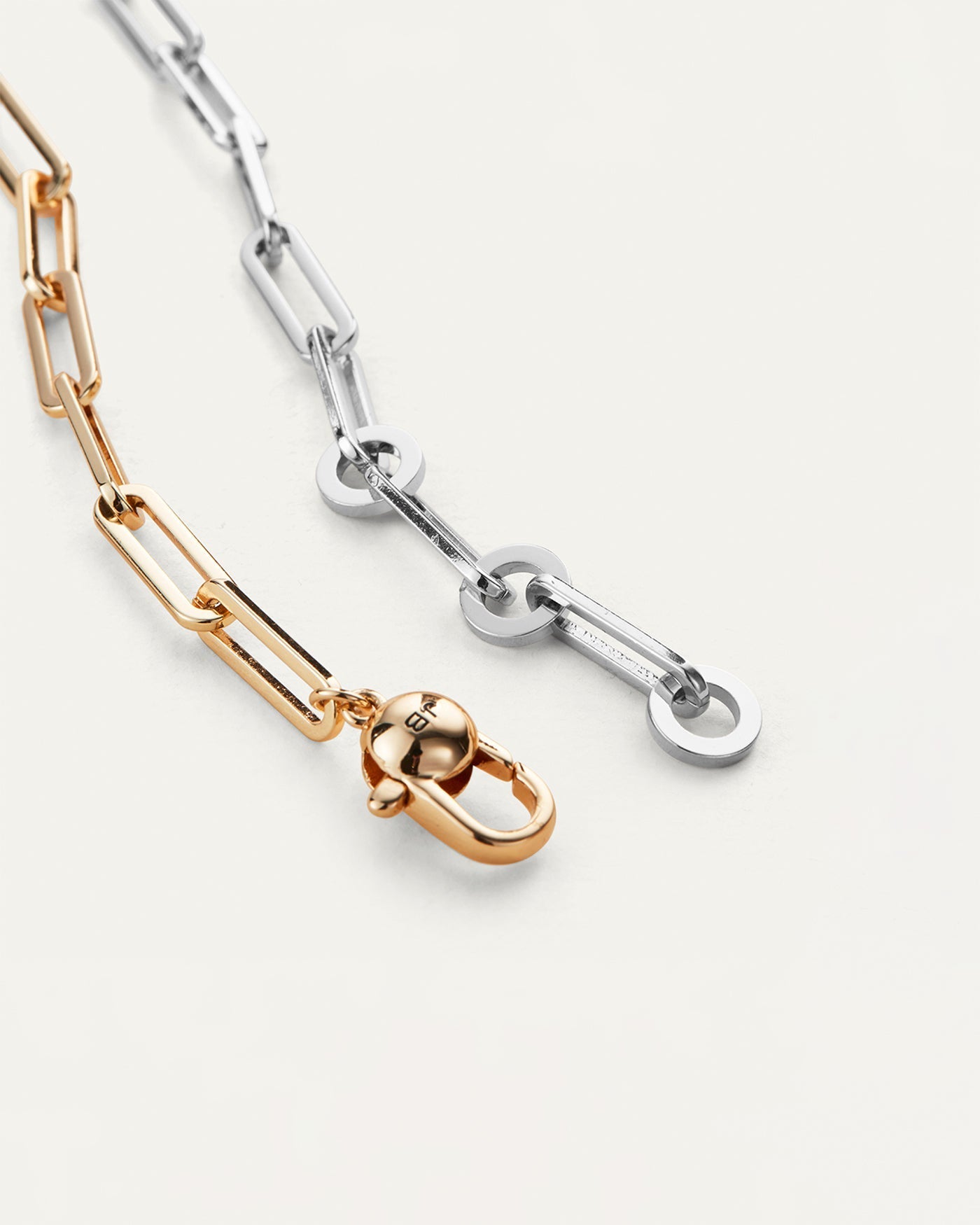 A modern paperclip necklace with a refreshed, crisp silhouette. This design includes non-removable extender rings, making it easy to adjust to your ideal length. Finished in high-polish gold and silver.