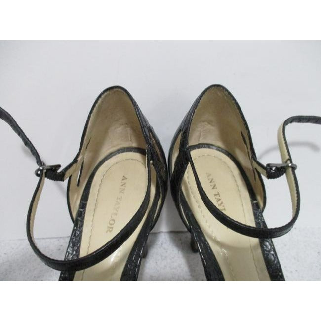 Ann Taylor Black Patent Croc Peep Toe Cut Away Pumps. 1/4" wide ankle strap. Size 9M. Stacked 3-1/2" heel. All measurements are approximate. S6-7