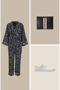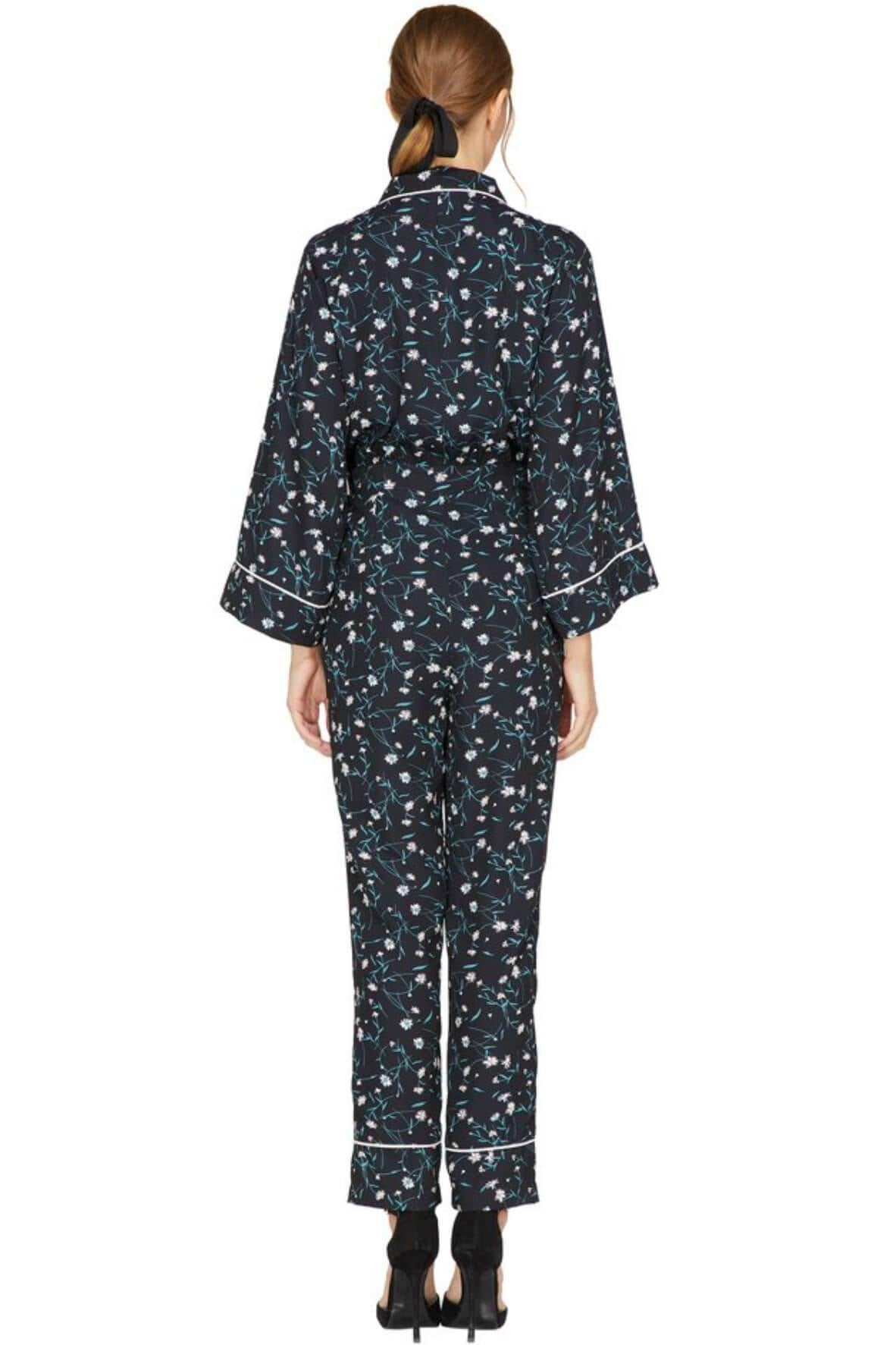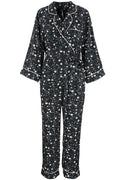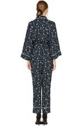 Woven printed pajama jumpsuit with contrast corded piping, loosely tapered leg, waist tie, hip pockets, and front zipper. Snap button was added to cover cleavage area. Model is 175cm tall, wearing size XS.