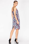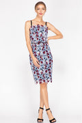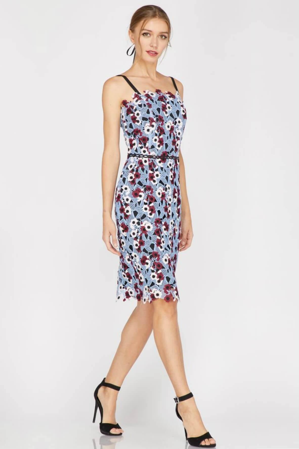 Woven multi-color floral lace sheath dress with boned bodice, lace trim, scallop edges and adjustable straps. Center back invisible zipper. Model is 175cm tall, wearing size XS.