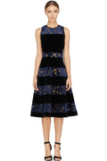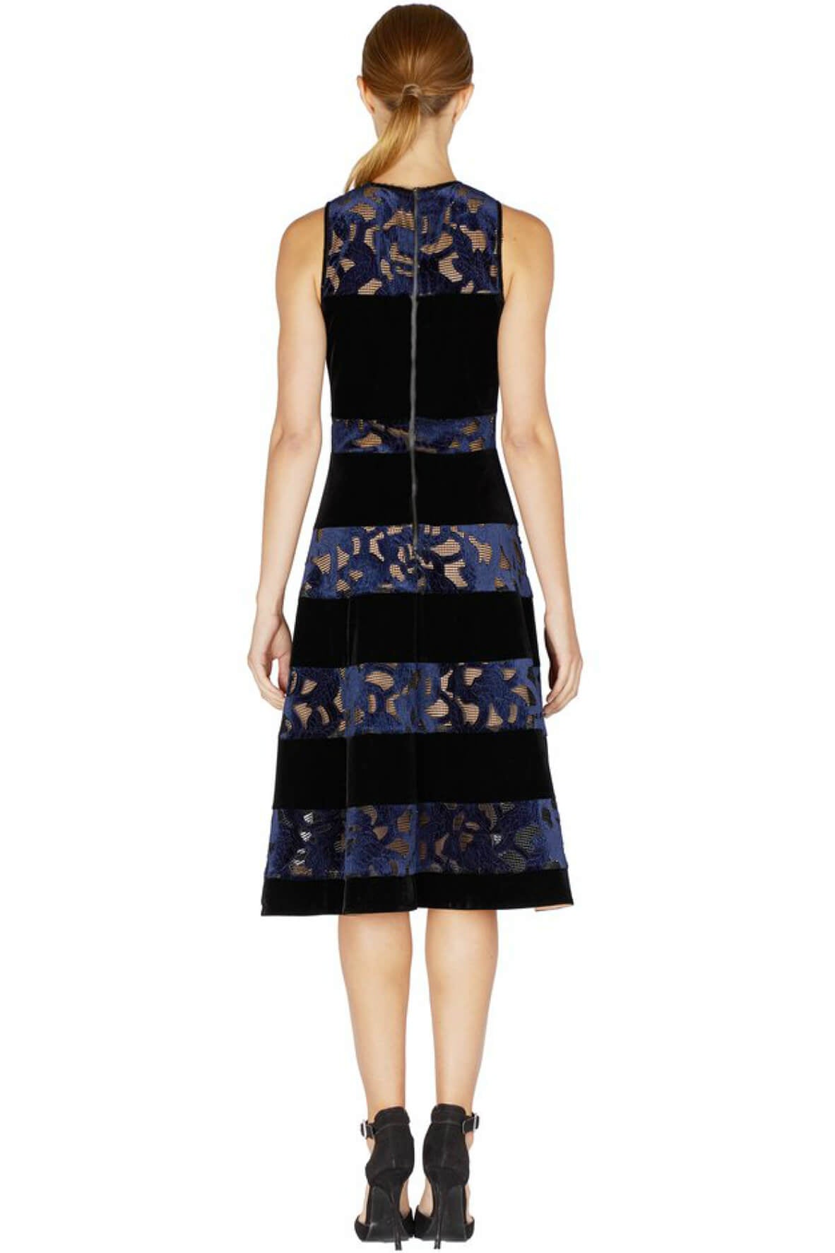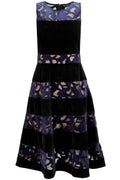 The laser cut velvet lace dress is midi length fit & flare with contrast velveteen panels and velvet tape finishing at neck and armholes. It has center back exposed zipper. Model is 175cm tall, wearing size XS.