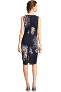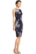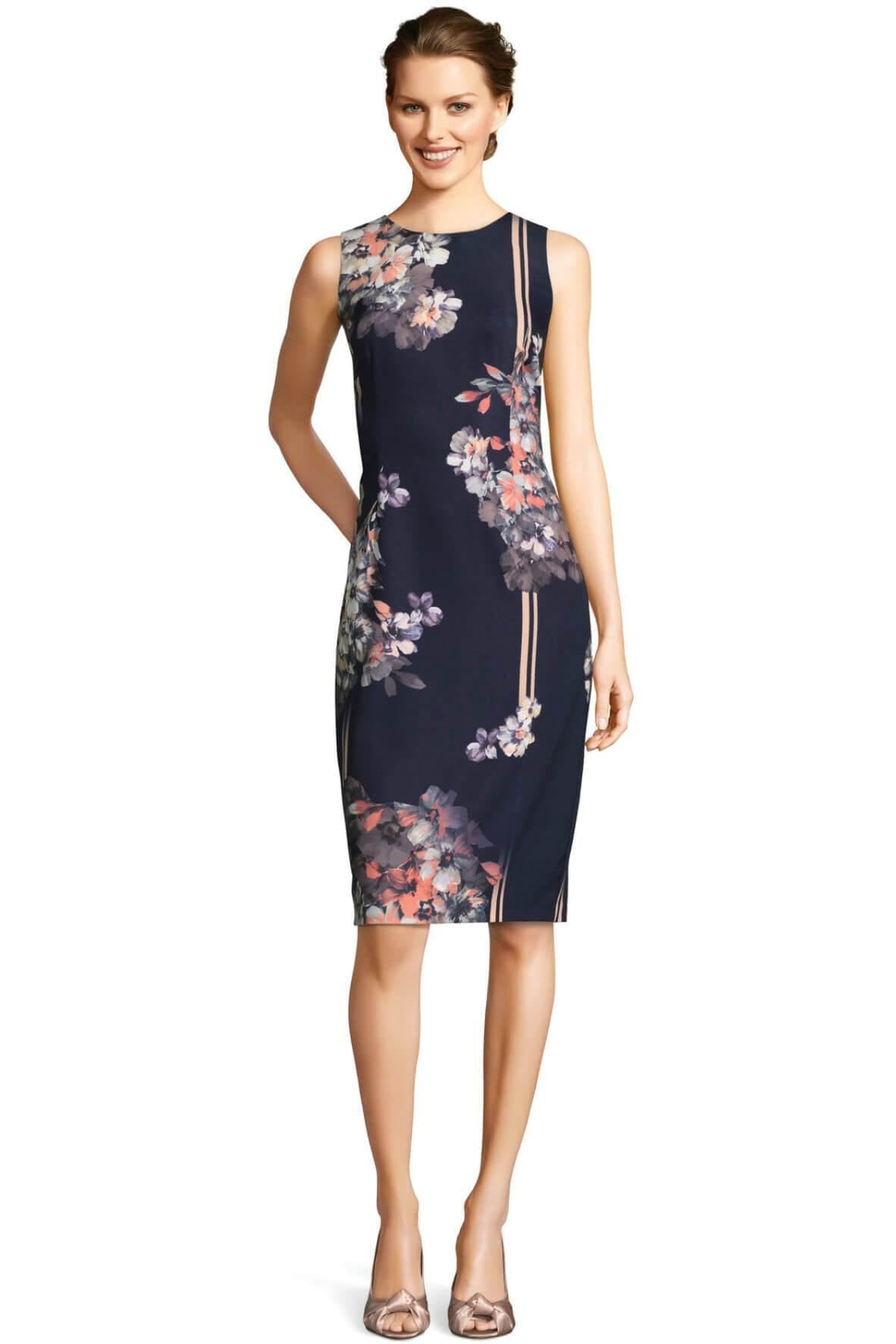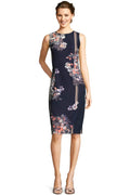 Contrasting moments come together in this chic look. This sheath dress features a sleeveless bodice, crew neckline, and a midi-length silhouette. Crafted from soft Tiffany twill-a crepe fabric-this fully-lined dress has a touch of stretch for your day. Mixed painted floral prints contrast a bold stripe in this linear garden design. A hidden zipper back closure that runs down to a slit skirt completes the look. Style this floral dress with a nude heel and let it shine from day to night.