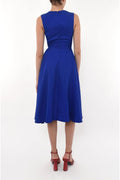 Crew neck fit and flare sleeveless dress. A fitted bodice that flares to a voluminous A-line skirt. It has deep pleats front and back, an open, rounded neck and discreet side-seam pockets.