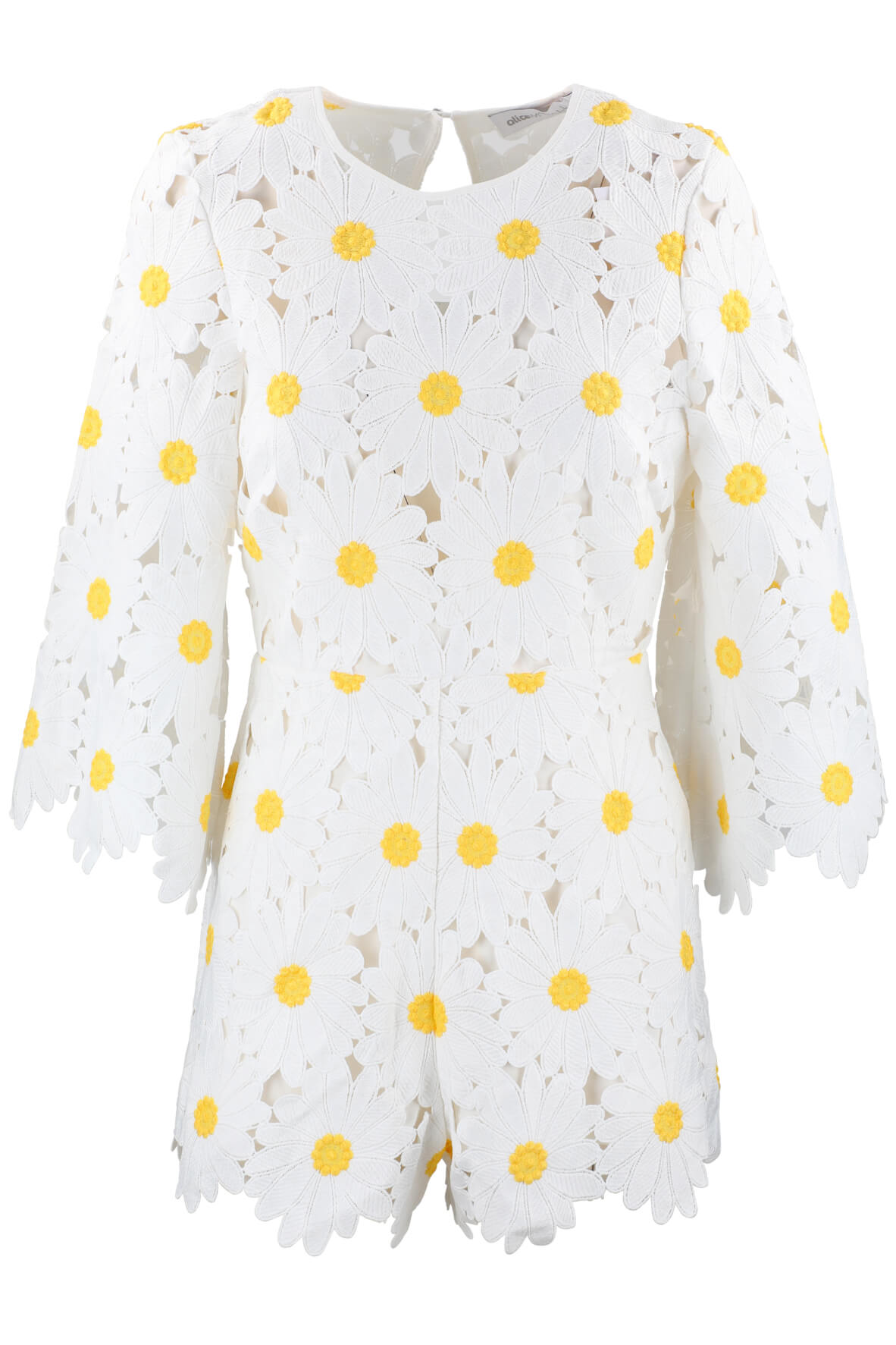A sweet yet classy playsuit style in daisy embroidery. Despite the high neckline, this piece is modest but still stylish with its see through bodice and keyhole back. Nude undergarment is advised.