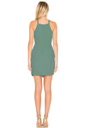 A structured mini dress featuring its square neckline and fitted bodice with covered open slit detail. Model is 178cm tall, wearing size S.