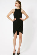 The Alexia mini dress in black features an asymmetric hem with pleated detail to the front. Racer neckline sleeveless dress with concealed centre back zip fastening. Model is 178cm tall, wearing size XS.