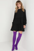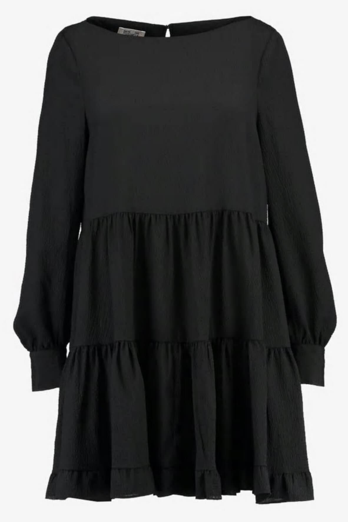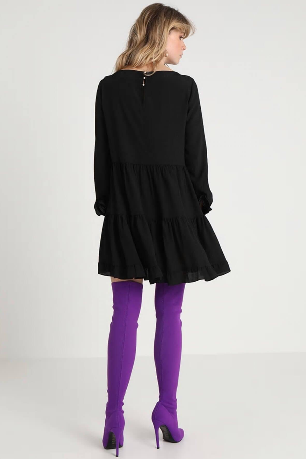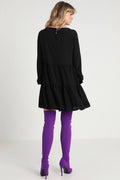 Loose fitted mini dress with boat neck and button fastening at back. Blouson sleeves with ruffles and buttons at cuffs.