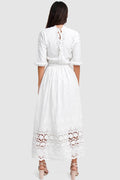Reach your spring/summer fashion goals with the All Eyes On You Midi Dress. Feminine and flattering, this effortless bohemian-inspired piece features intricate lace detailing from top to bottom and is beautifully finished with elbow length sleeves with a ruffled trim. Pair it with heels for evening events or wear it with sneakers for a casual day look.