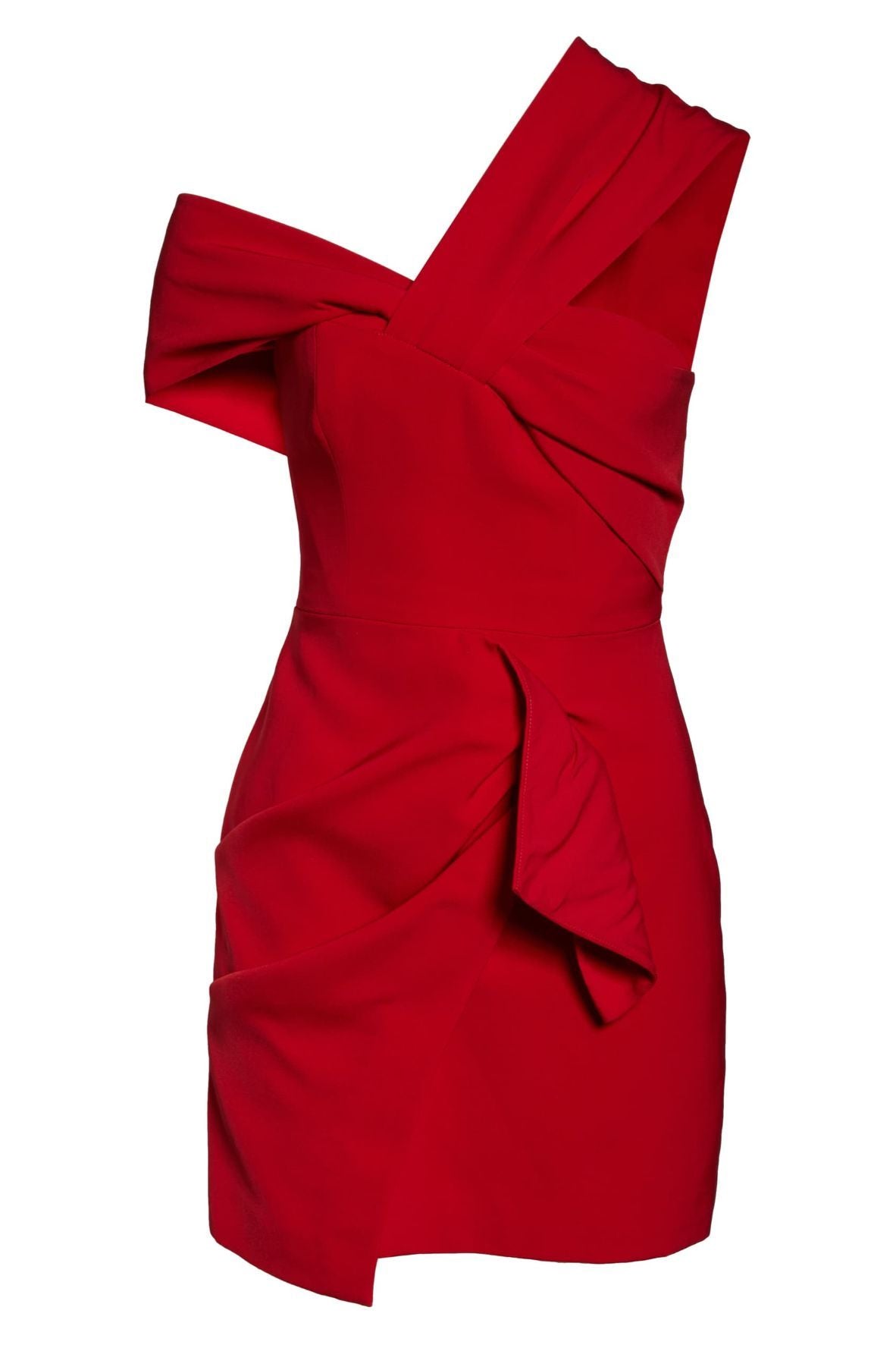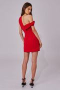 Cameo Collective Caliber Mini Dress is a fun and flirty party style in a structured mid weight fabric. It features asymmetric neckline with pleated strap and off the shoulder draped sleeve. Detailed with fitted bodice, cinched waist and mini with front fold overlay. Finished with concealed zip closure at back.