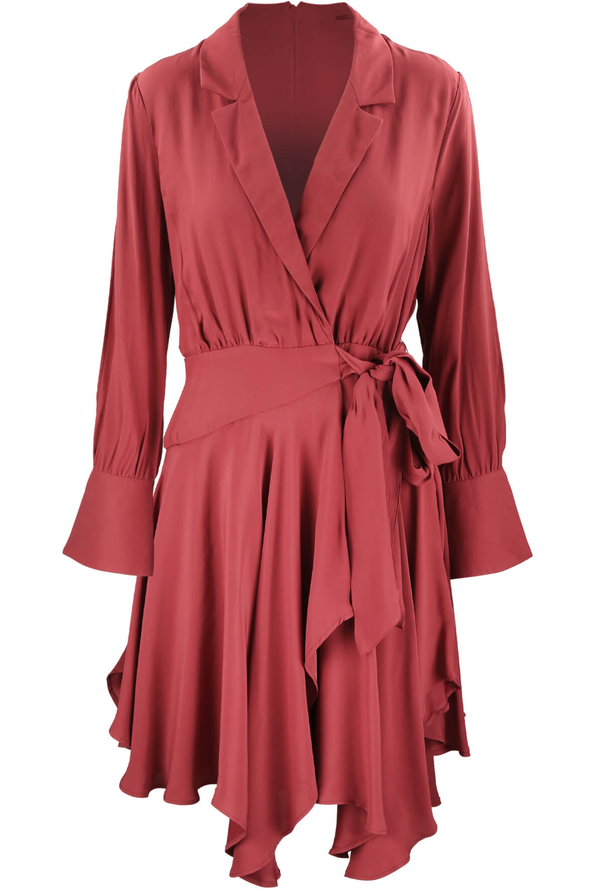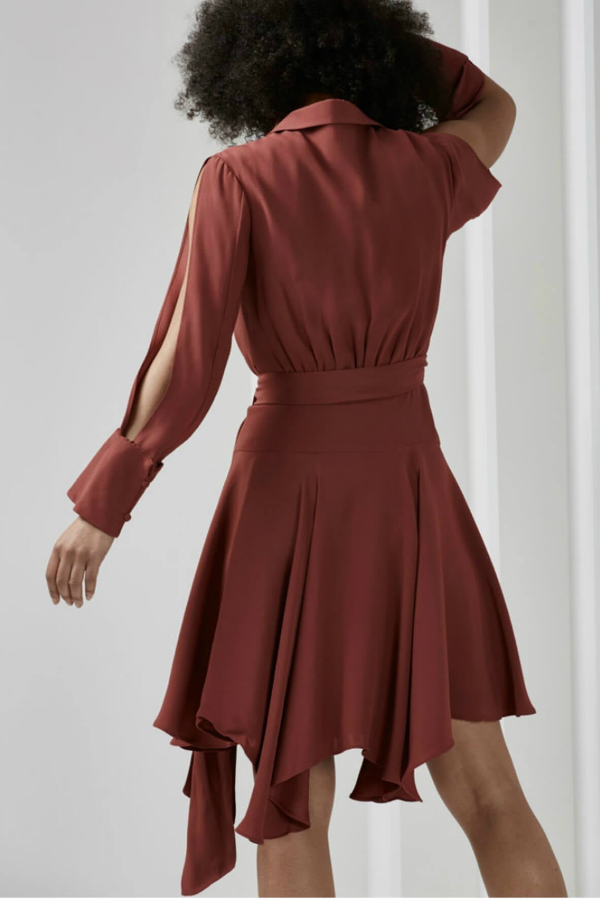 A functional wrap dress with ties made from a silky lightweight fabric. It features flared hem, cuffs with splits and buttons. Model is 173cm tall, wearing size S.