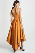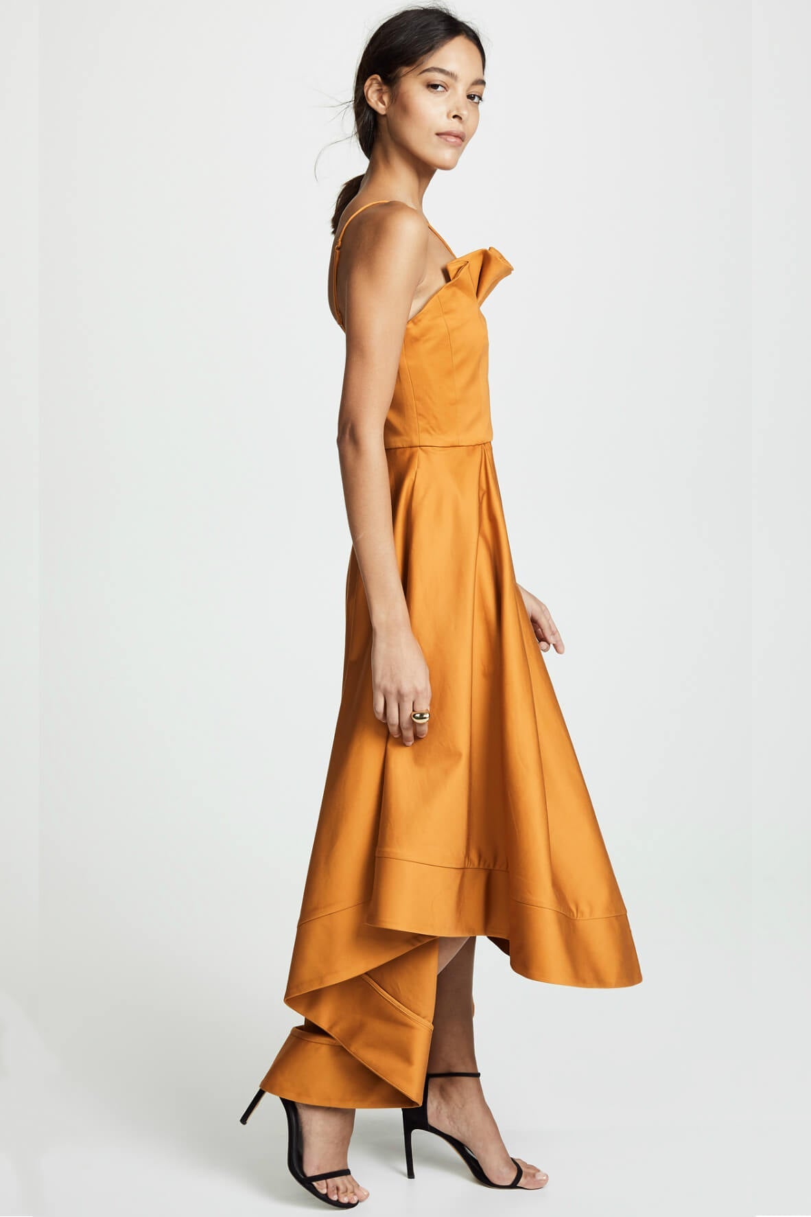 This gorgeous fitted dress features back zip closure, inseam pockets, pleated volume along front neckline, boning in bodice, adjustable halter rouleau straps, and high low shaped hem.