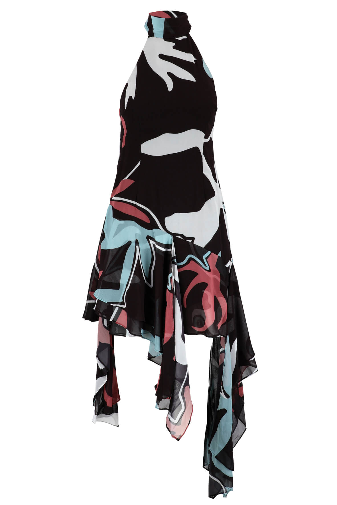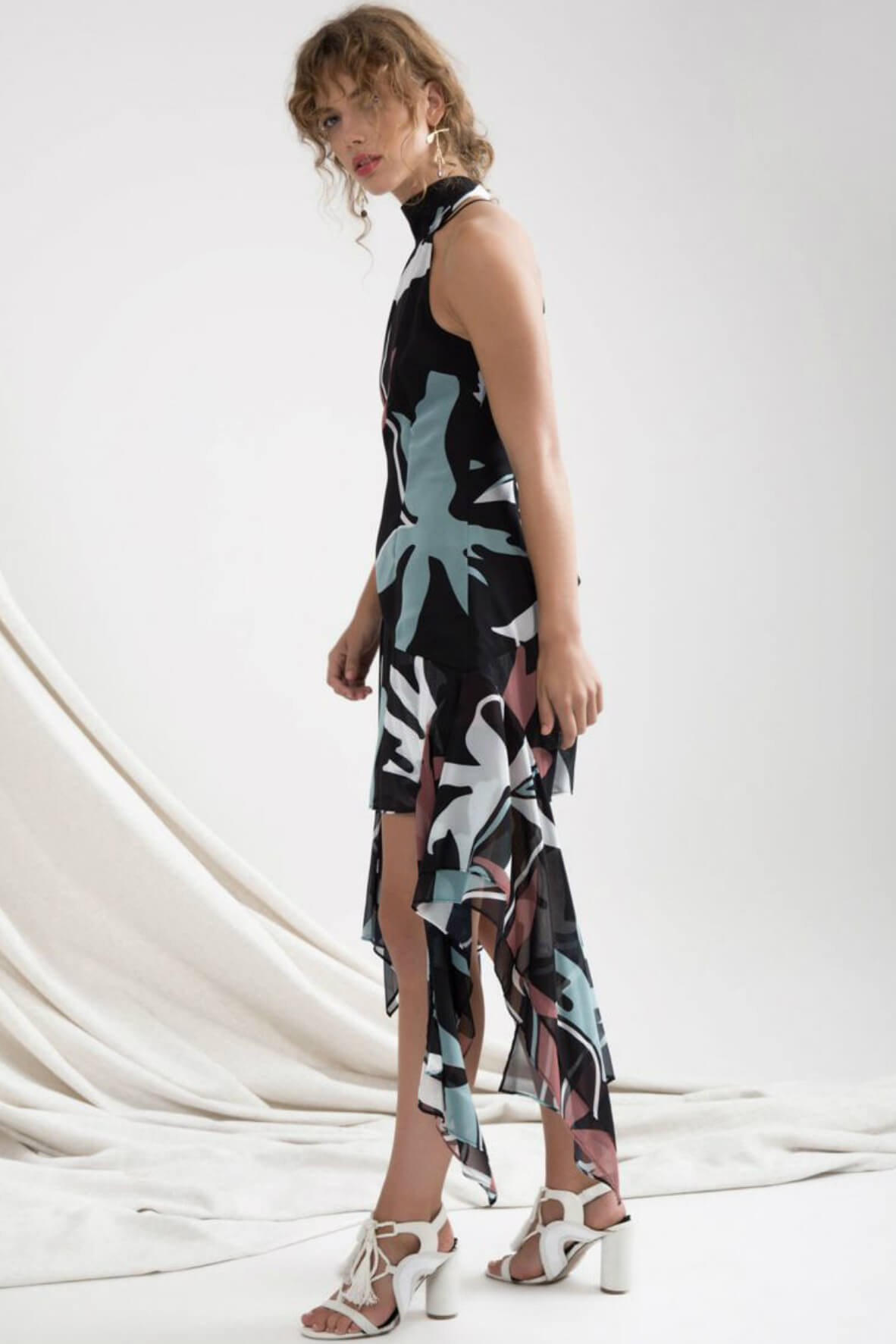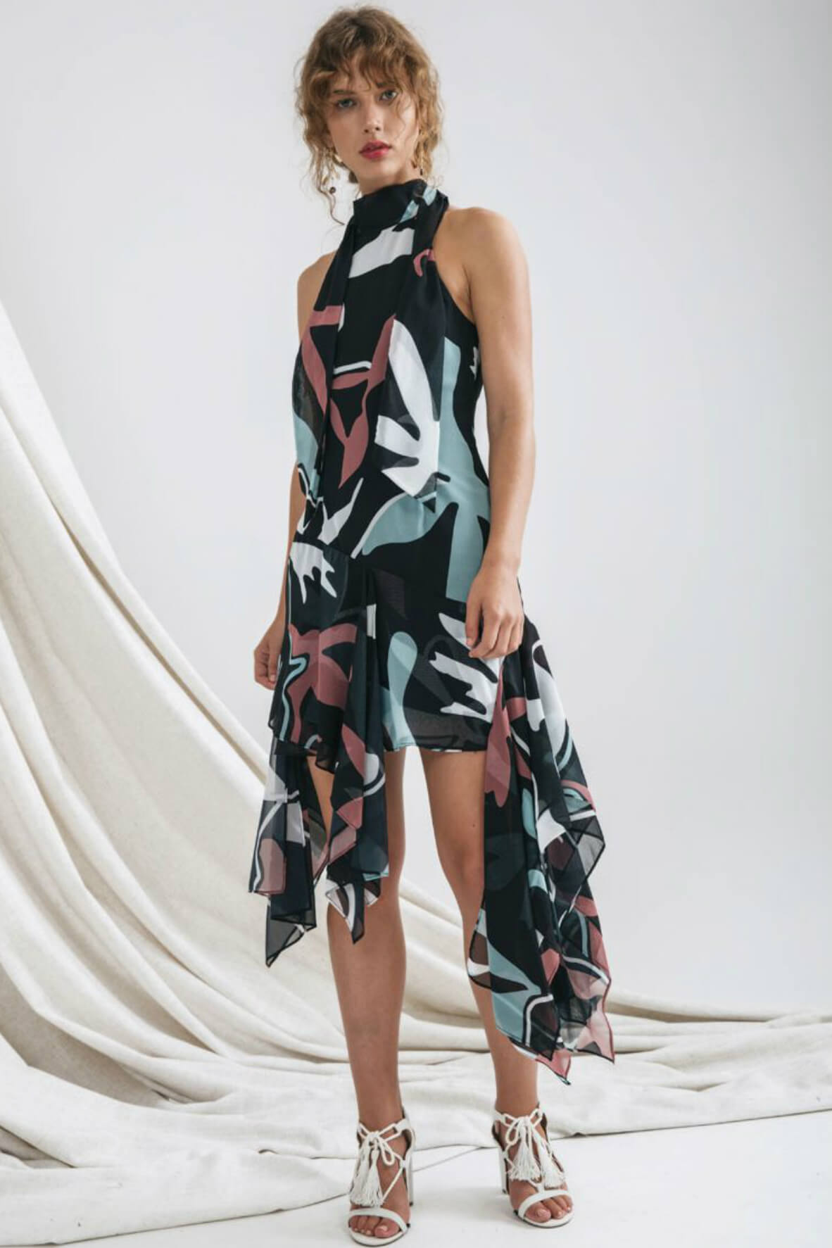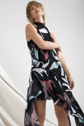 The perfect asymmetrical dress to twirl around in. Featuring a high tie neckline with rouleau loop neck straps. A fit and flare silhouette, asymmetrical hem with tiered chiffon layers. Finished with a Partially lined. Back zip closure. Model is 170cm tall, wearing size S.