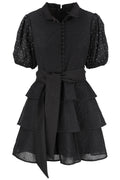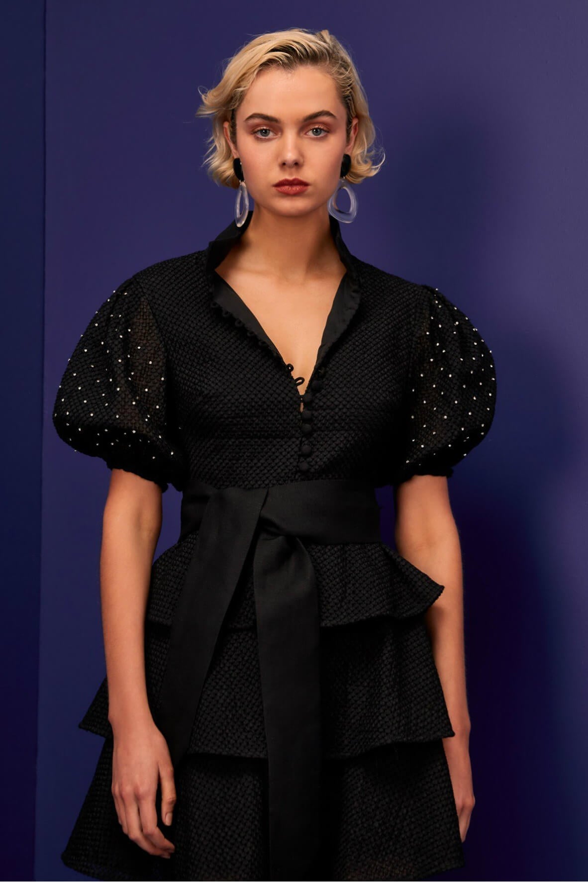 This amazing mini dress features button-up closure at front, detailed with elasticized statement sleeves with diamante detail and tie at waist. Finished with 3-tier skirt and invisible zip closure at back. Model is 170cm tall, wearing size S.