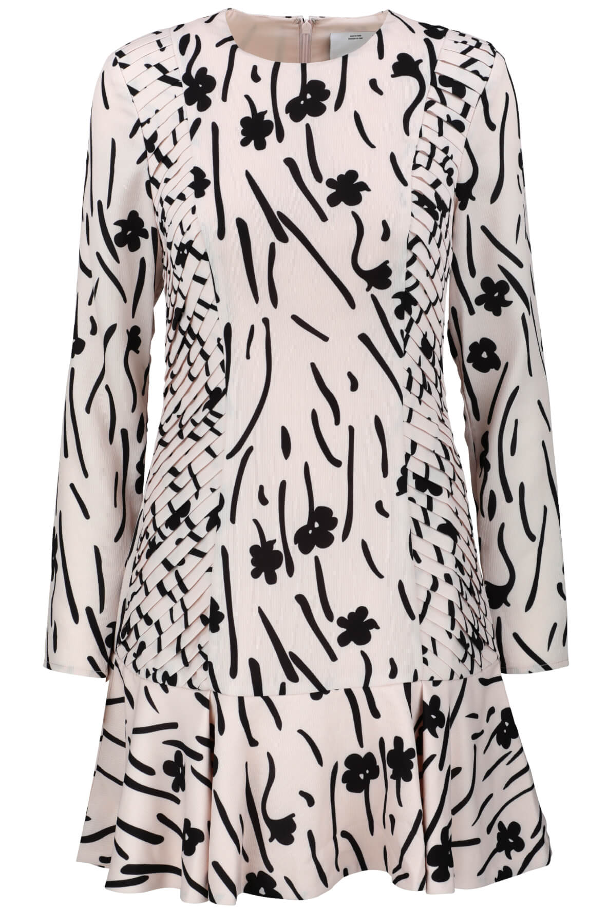 The fitted mini dress has invisible zip at back, angled pin tucking detail down sides and a skirt frill panel. Model is 170cm tall, wearing size S.