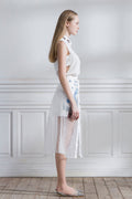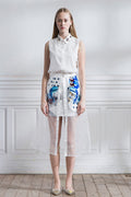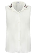 The White Embellished Shirt features a buttoned up top with embellished pointed collars and cut outs on the side of the top. The embellishments adding an edge to the top. Pair this top with a skirt slightly unbuttoned for a feminine look. Nude undergarment is advised.