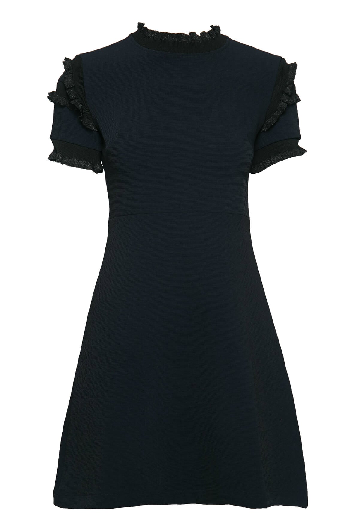 Add some charm to your look with the pretty and playful metallic frills of this black mini dress by Few Moda that features high neckline.