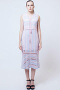 There’s nothing quite as sweet as the Clarinda Dress. This darling number features a v-neckline, sleeveless bodice with a tassel tie detail at front bodice. Highlights include an overall lace fabrication with crochet trim detailing at the neckline, waist and hem.