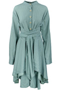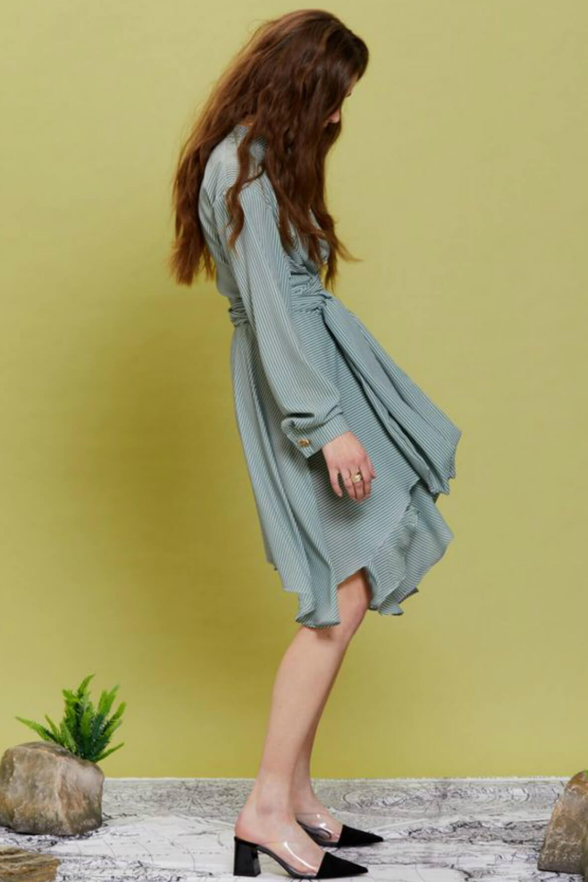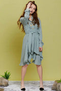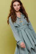 A jade green, long sleeve, mini dress fastened at the waist with a sash. Model is 171cm tall, wearing size S.