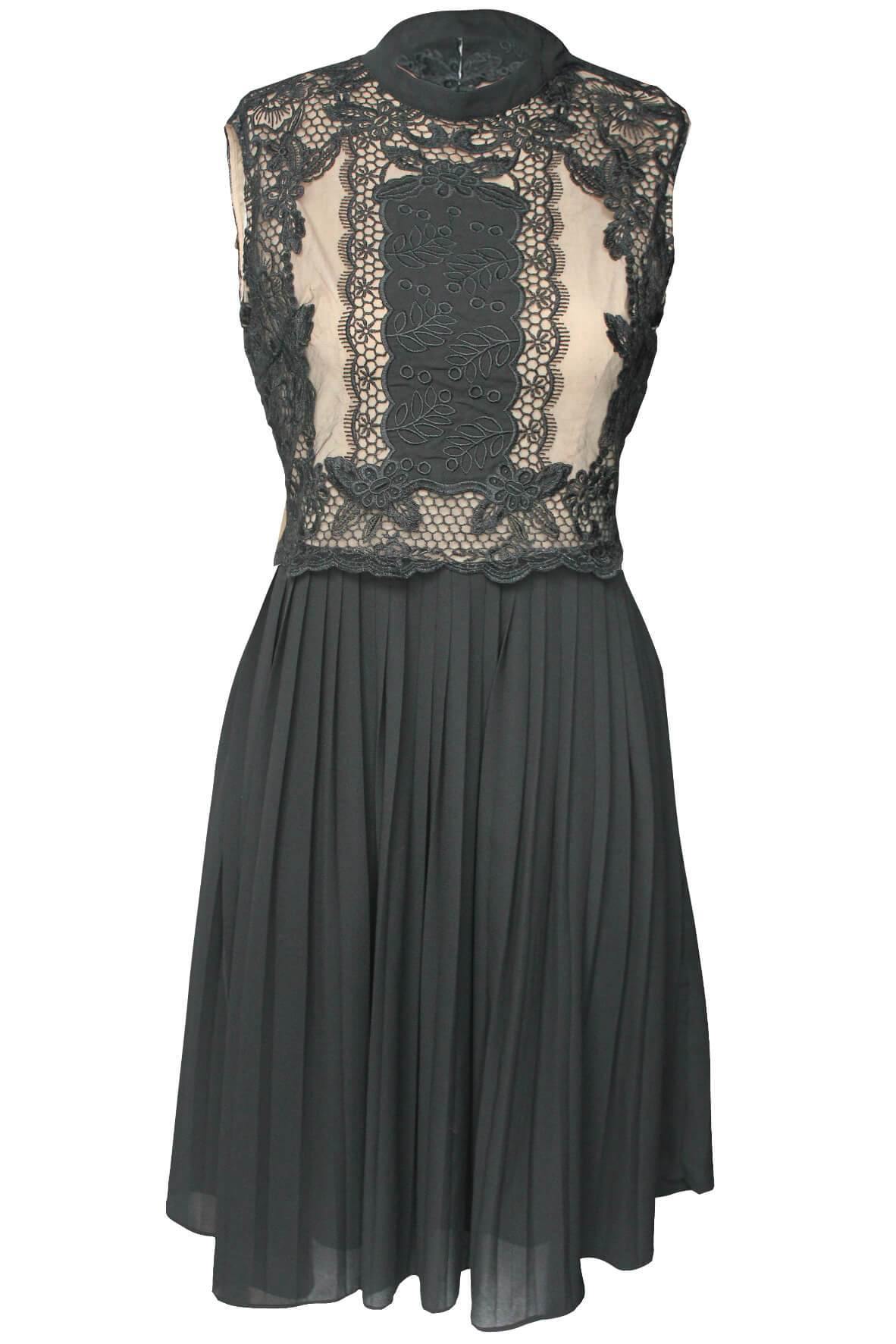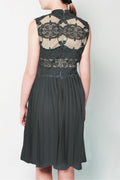 Black Lace And Pleated Dress With Ribbon Collar Detail. Model is 168cm tall, wearing size S.
