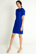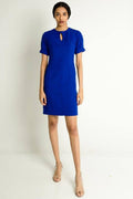 A classy blue dress with round neck keyhole detail and faux buttons detail at the front.