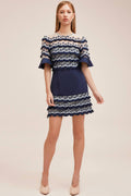 The No Promises Mini Dress is made light-mid weight embroidery fabric with texture mid-weight stretch crepe. Featuring an invisible zipper, partial lining, flared sleeve and contrast fabric detail.