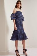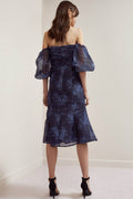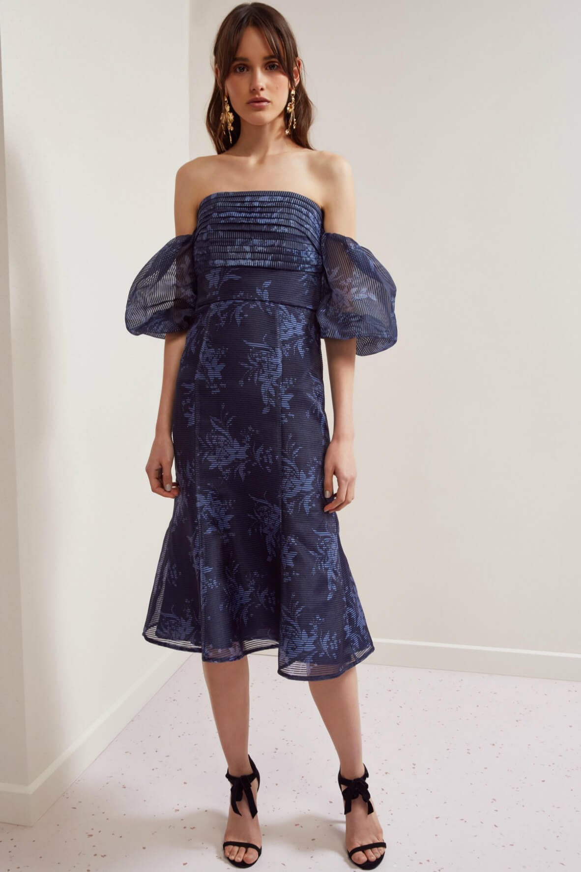 Stand Tall Midi Dress is a strapless style in a structured sheer self stripe fabric. Features straight cut neckline with pleat detail across bodice and attached balloon sleeves with elasticised cuff. Finished with waistband and slim fit midi with fluted hemline. Concealed zip closure at back. Bodice includes boning and inner movement tape. Lined. Designed to be worn fitted.