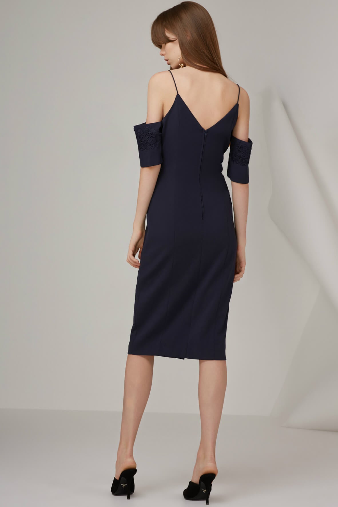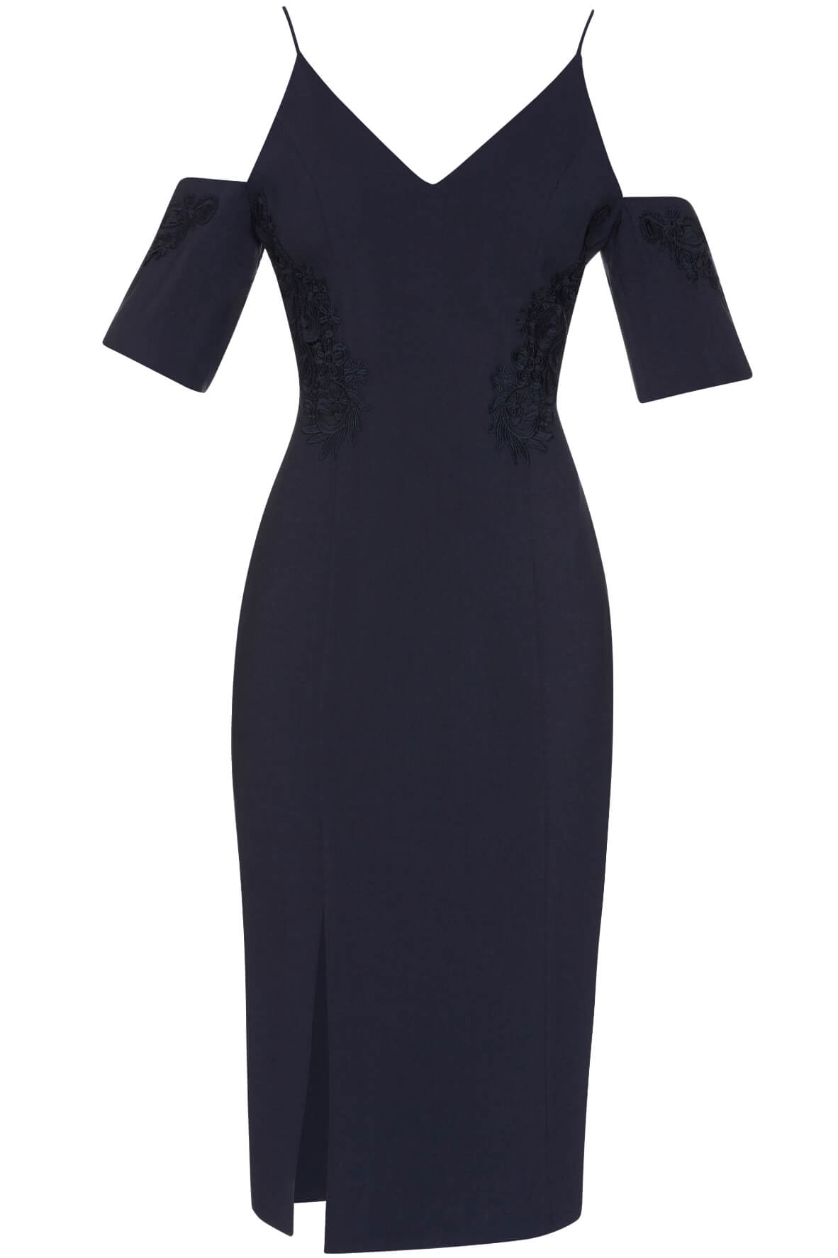 This off-shoulder evening number features gorgeous tonal embroidery on the bodice and sleeves.