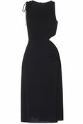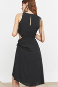 The beauty of this midi dress lies in its simplicity and beautifully balanced details. It features a full, asymmetric skirt with a statement cut-out detail on the waist that’s perfectly complimented by adjustable ruching on the left leg and right shoulder. It’s a timeless style that will work season after season. Hook-and-eye closure at the back.