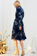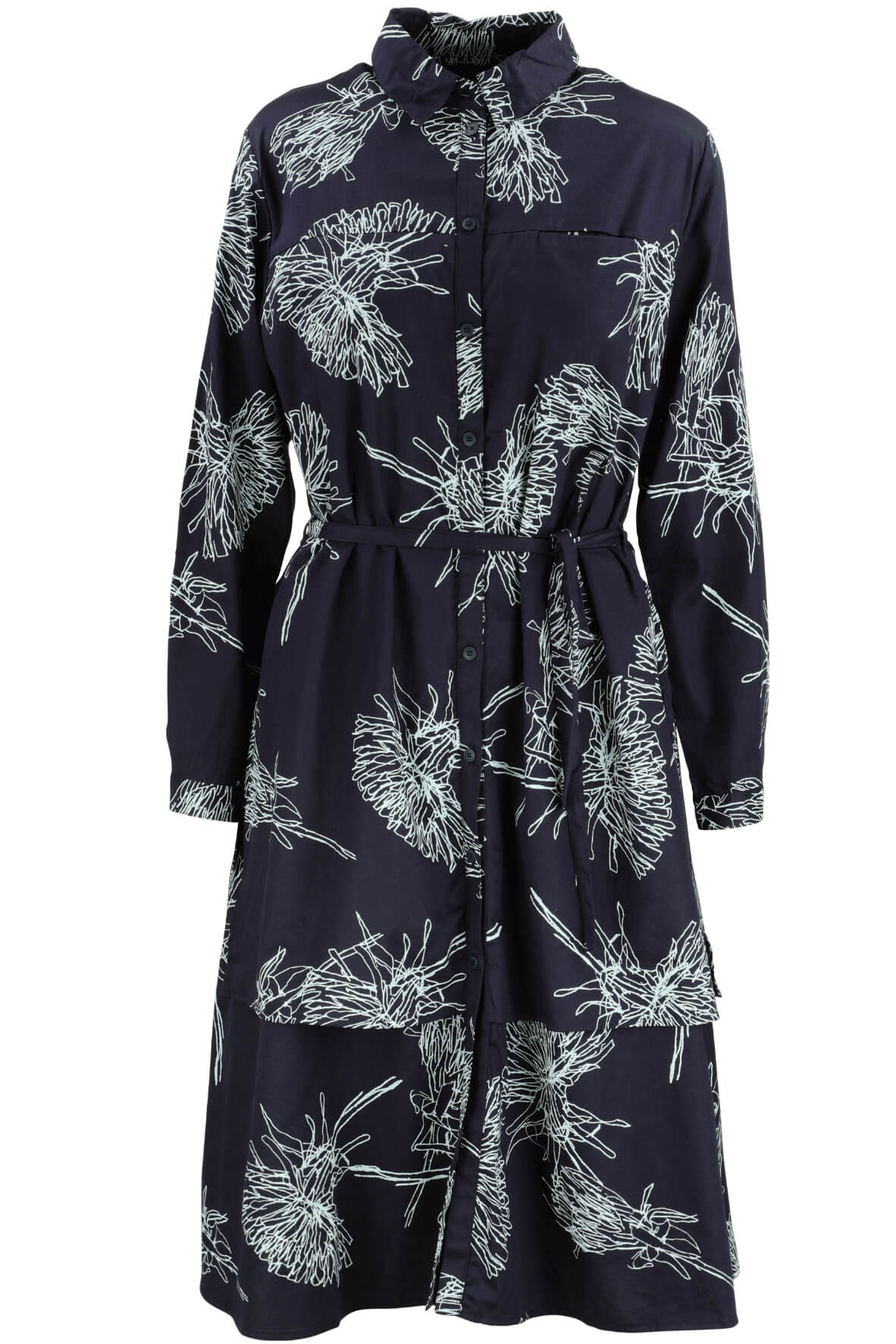 This gorgeous printed shirtdress is Double layered hem, side seam pockets, self-fabric belt, and full sleeves. Wear it as is or open with pants and a top underneath.