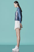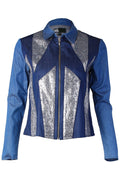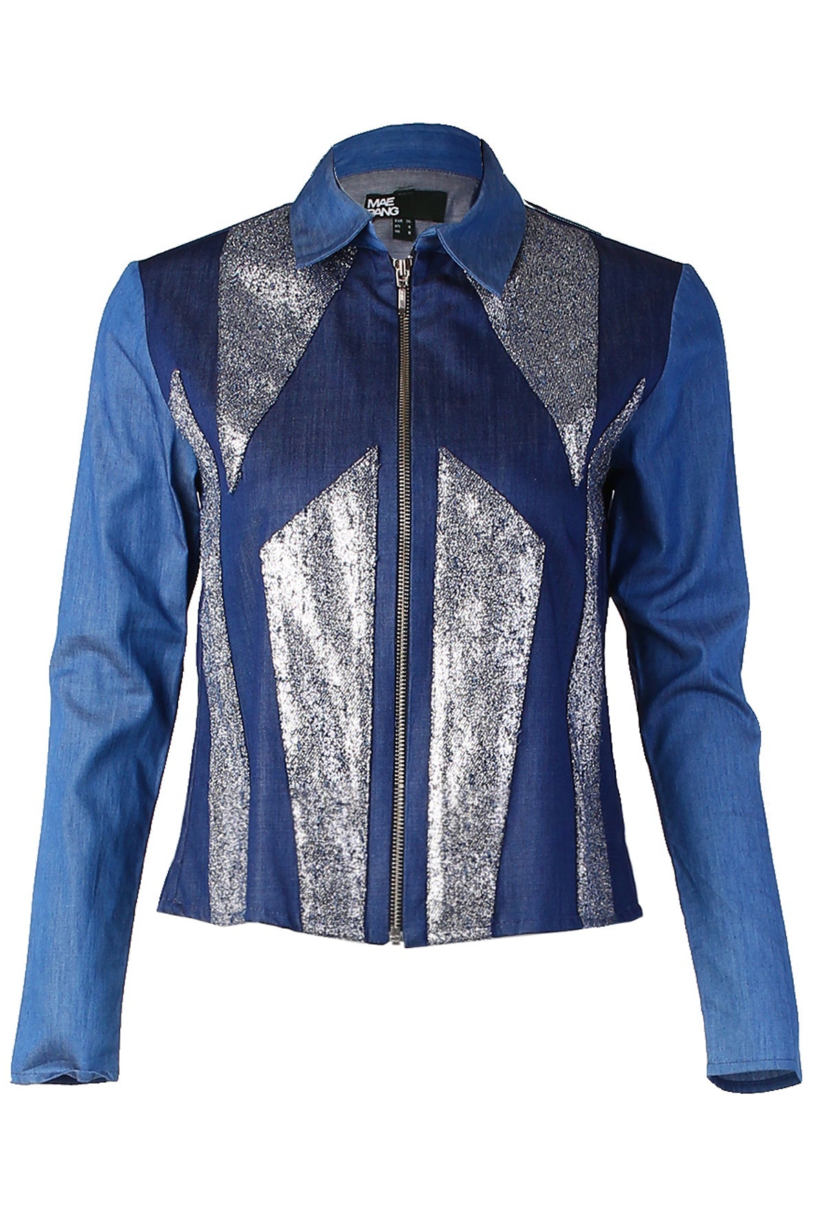 The Glitter Fossil Denim Zip Shirt is a two toned long sleeve collared shirt with a zip and split back detailing at the back, the shirt also features silver fabric placed strategically on the front of the top, resembling fossils. Pair this top with a pair of black jeans or shorts.
