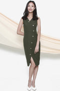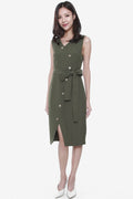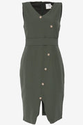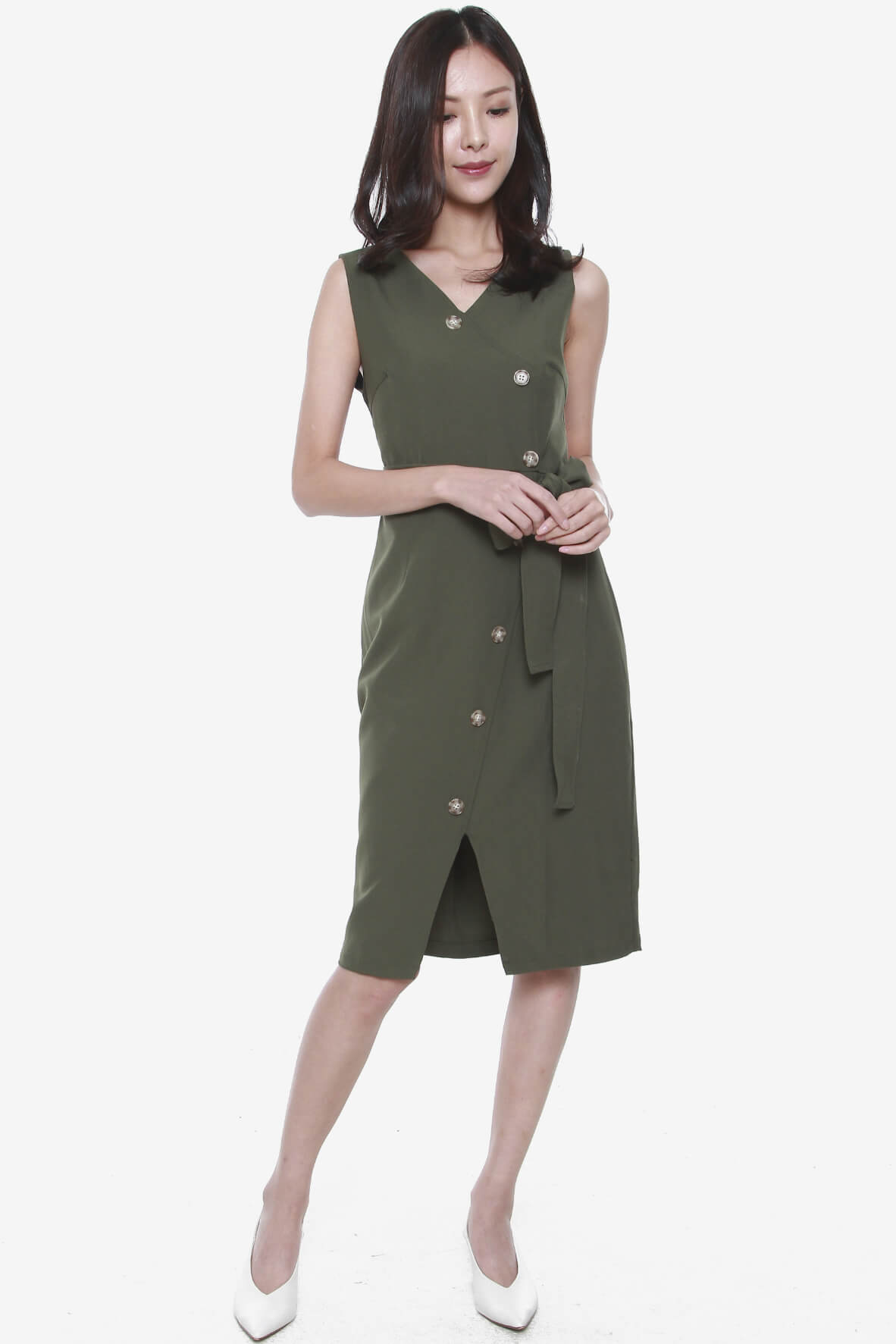 The Mint Ooak overlap pencil dress features front Button details, is sleeveless with V neckline and self-tie.